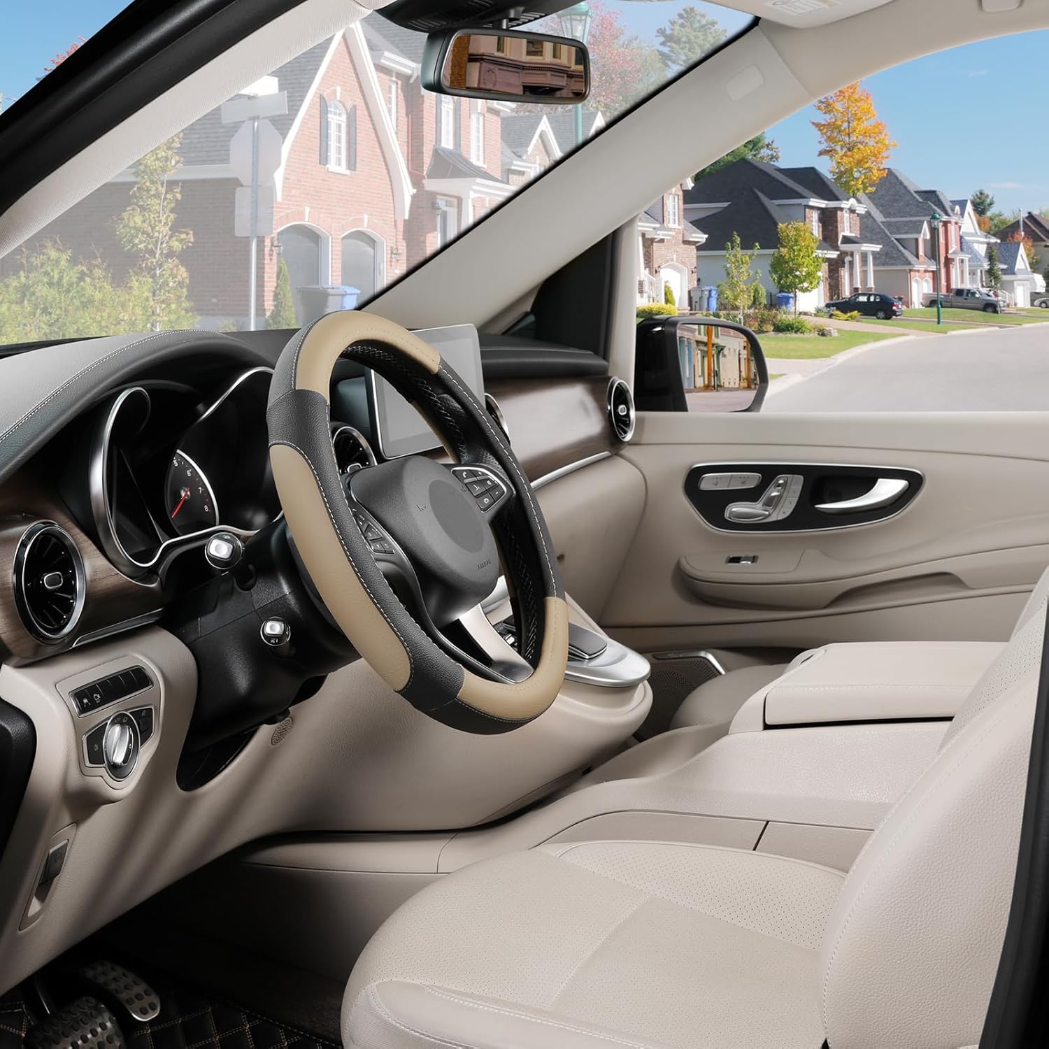 - NO MORE STICKY: The auto steering wheel cover is comfy to hold, it absorbs the hand-sweat that the summer heat causes, and allows you to grip the steering wheel much better.