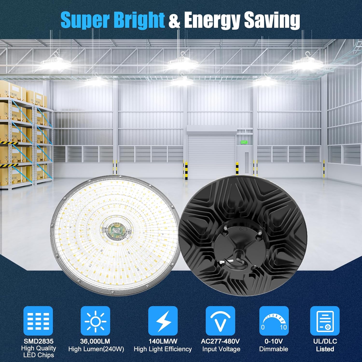 - Commercial-Grade Lighting Efficiency -- Our commercial bay lighting maximum output of 36000lm. 240w ufo led high bay light uses high-efficiency LED chips SMD2835 which can reach 150Lm/w, Saving 90% electric bill instantly. Ensuring safe, shadow-free environments for warehouses, workshops, and large facilities.