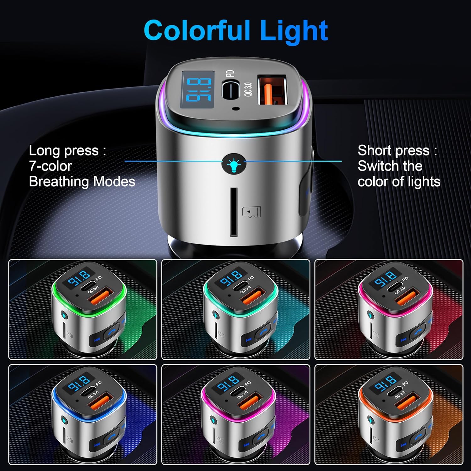 - 【Multifunctional FM Transmitter】The bluetooth for car supports Bluetooth play and TF card play (up to 32GB).It can achieve crystal clear voice commands to ensure safe driving.You can stay focused on the road by awaking Siri or Google Assistant in making phone calls.The bluetooth transmitter car also have 7 colorful lights for your to choose.
