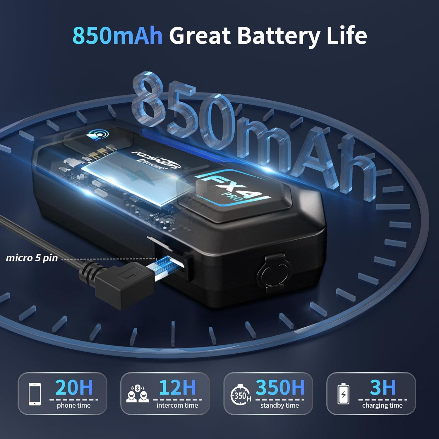 - 【Long Battery Life & Easy to use and install】The FX4 Pro motorcycle helmet intercom system come with 850mah Battery support up to 20 hours of phone time, up to 12 hours of intercom time, and up to 350 hours of standby time with 3 hours single charge, Easy setup to detachable boom microphone and button microphone for full face/ modular flip up/ 3/4 open face helmet. It's perfect for daily commute/ long road trip.