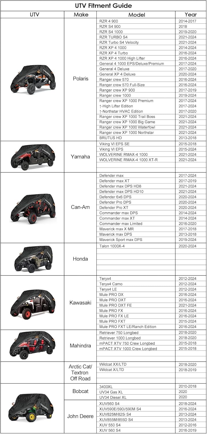 - Always Protecting Your UTV: Features taped seams, reflective striping, and adjustable straps and buckles for secure fit and nighttime visibility. The cover helps deter theft by concealing your UTV and prevents it from being blown off