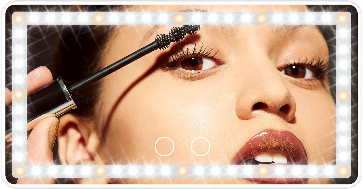 - DIMMABLE BICOLOR LED LIGHTS: The car makeup mirror has 12 yellow lights and 48 white lights, which is 40% brighter and 60% less energy than normal bulbs. Short press the 2 sensor switches to replace 3 light colors: white, yellow, white and yellow. Long press for dimming according to what you need. 2500-6500K color temperature is equivalent to outdoor sunlight, the makeup is naturally no difference