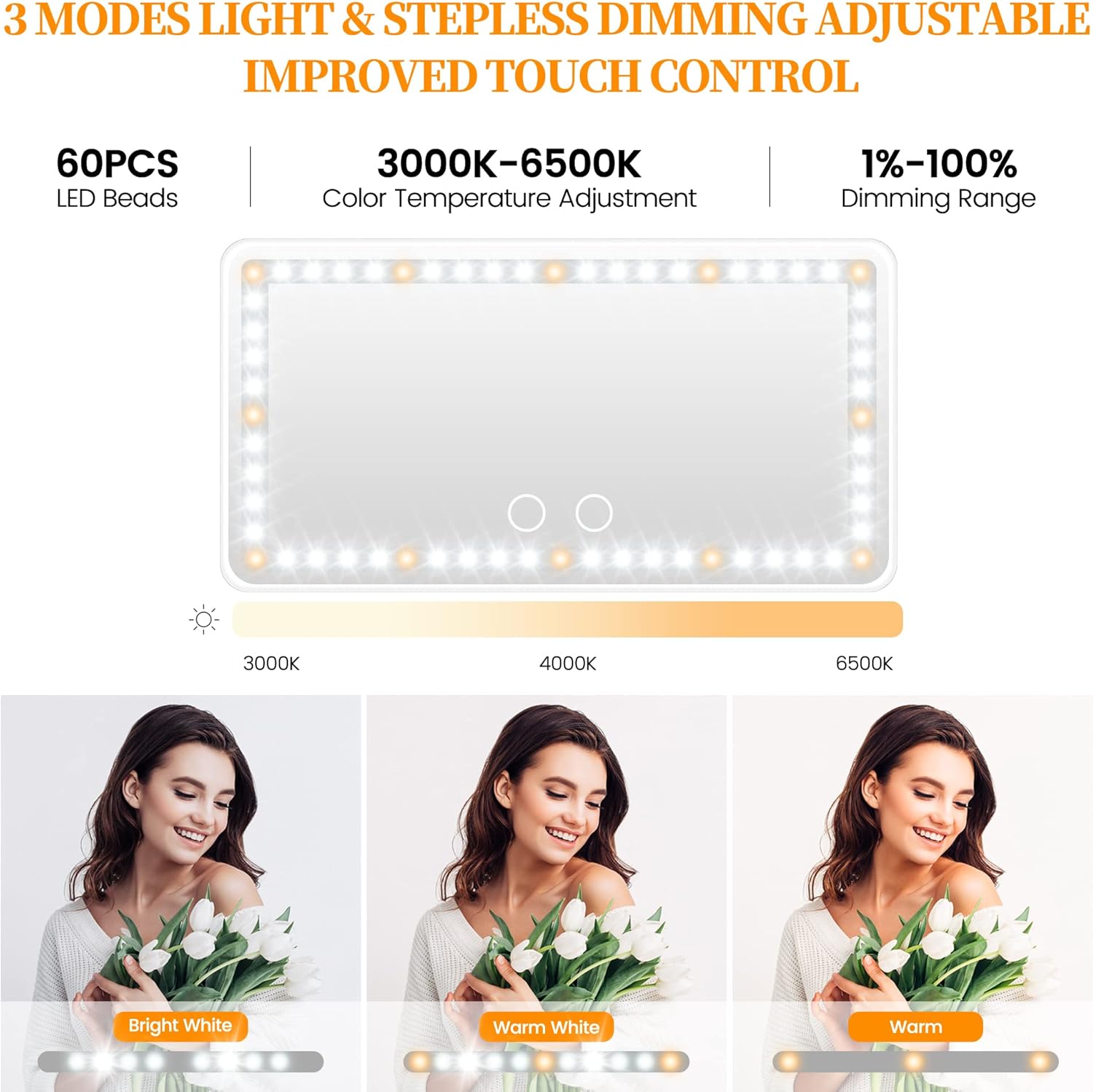 - SMART DOUBLE TOUCH CONTROL DESIGN: There are two touch sensors, simply touch one of touch switches to turn on and off. You can switch the two colors of the lights(cool white, warm yellow). Long press to adjust the brightness of the lights. The memory function restores this lighted mirror to its brightness and color the last time you used it