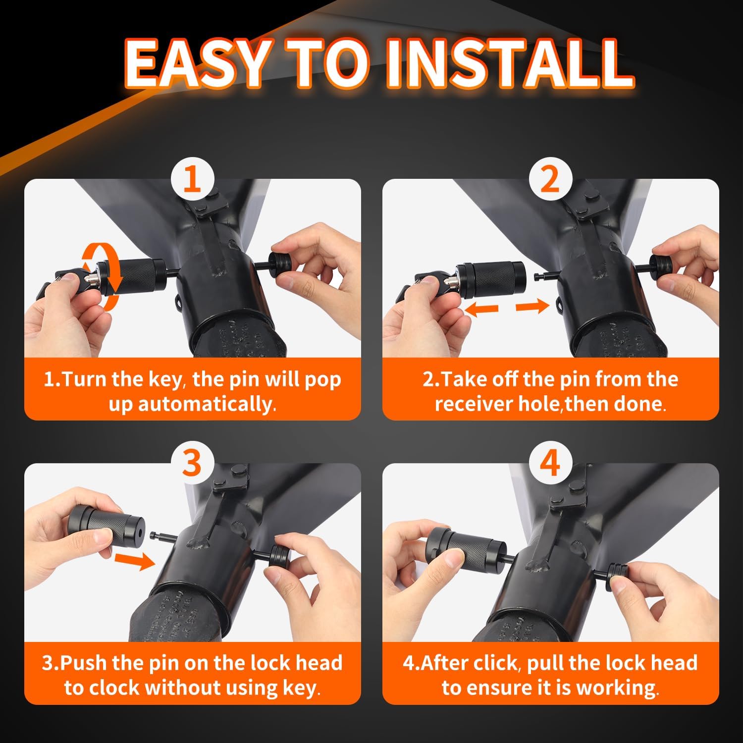 - [Push-to-lock Design] Our trailer coupler lock is designed for easy operation. With the push-to-lock design, you can easily push to lock it without using key. To open it, just turn the key a little bit and the pin will pop out by itself.
