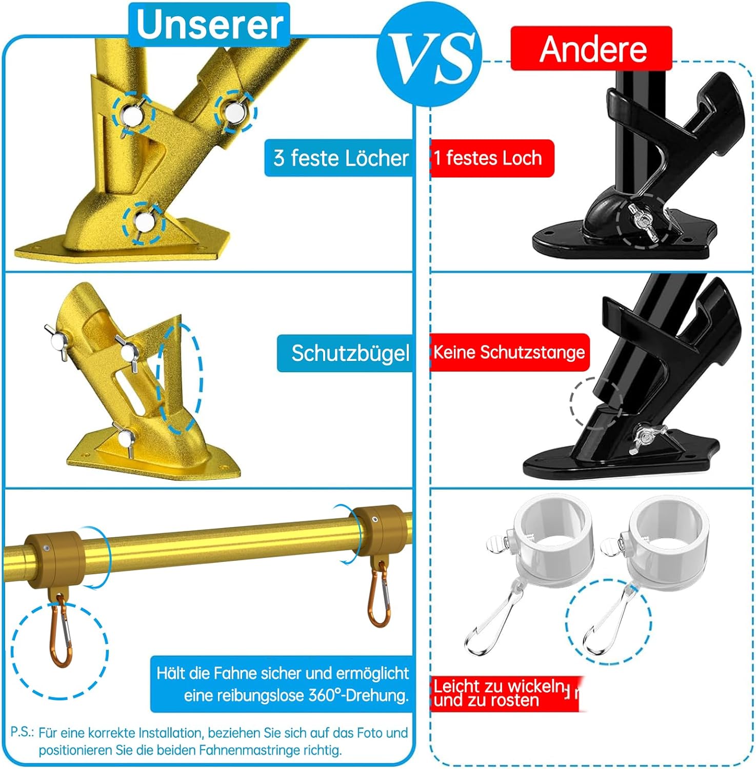 - 🇺🇲Upgraded Bracket and Tangle Free Rings: The high strength aluminum alloy flag pole holder has unique protective bar and 3 fixed holes to make the two-position (90° and 45°) flag pole more stable. The two new designed flag rings and two sturdy carabiners, which could make the flag tangle-free in the wind. And Adjustable length swivel flag pole kit can be installed according to the different size flags.