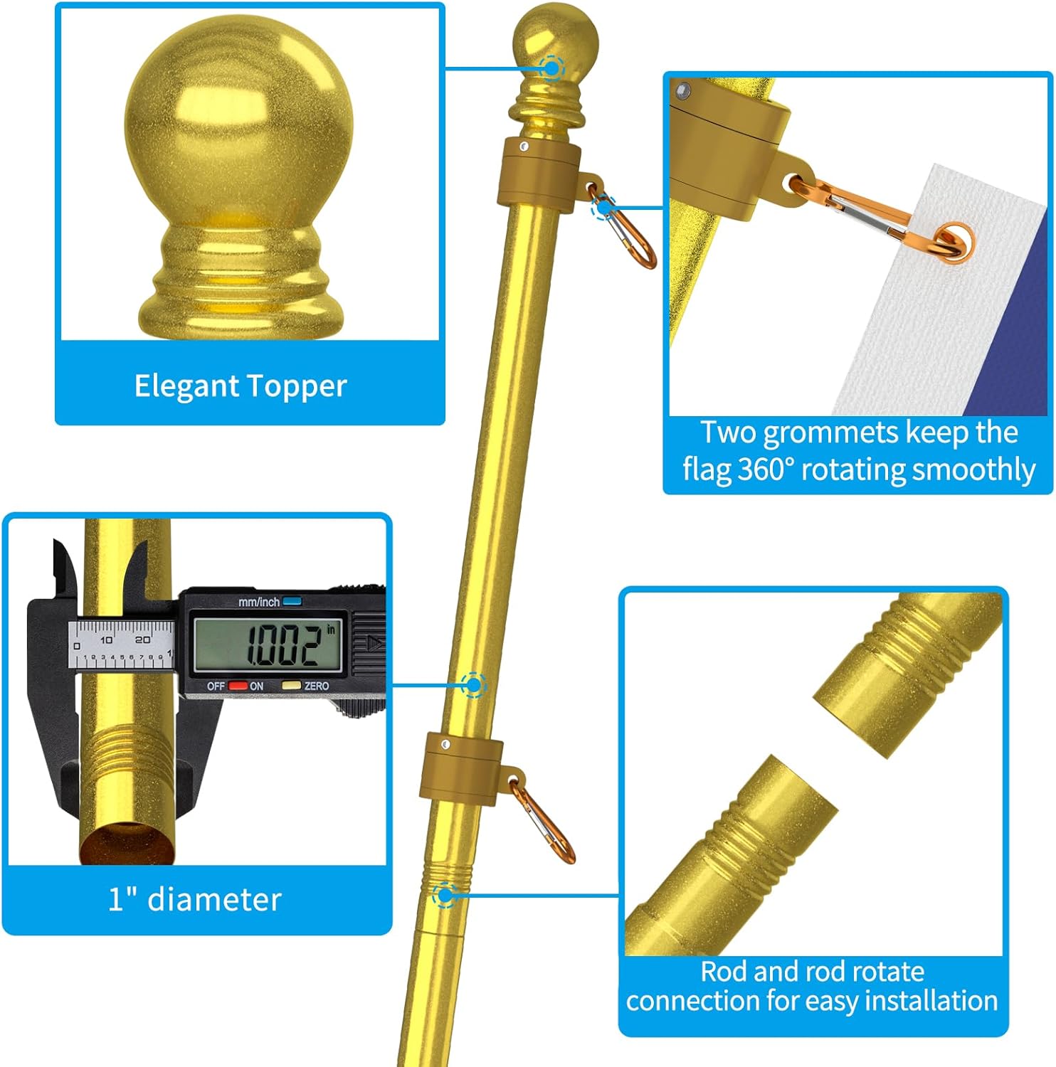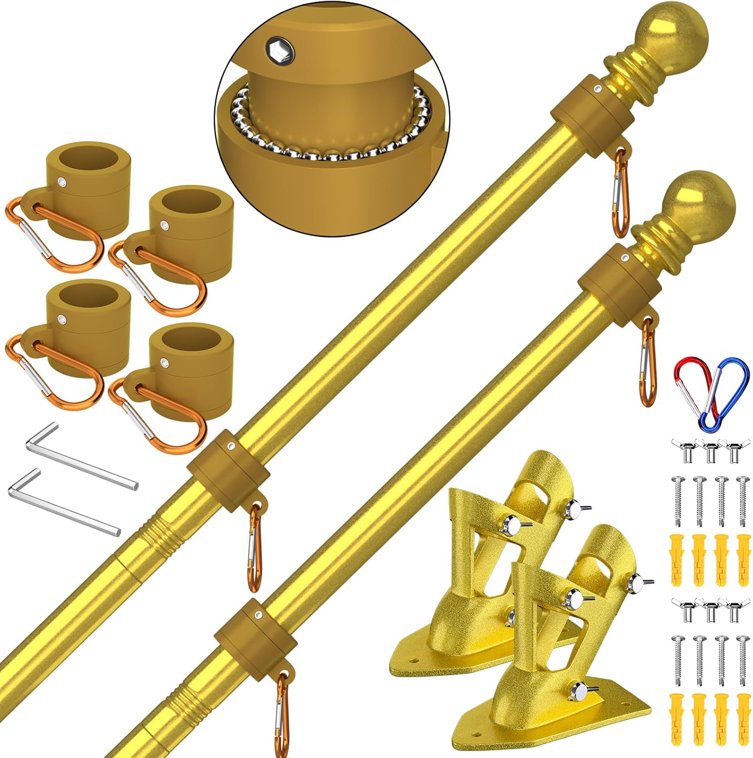 - Exquisite Design: 2*Flag Poles Diameter 1'', 2*Upgraded Brackets, 4*New Tangle Free Rings, 6*Carabiners, 2*Top Balls, 1*Installation Manual