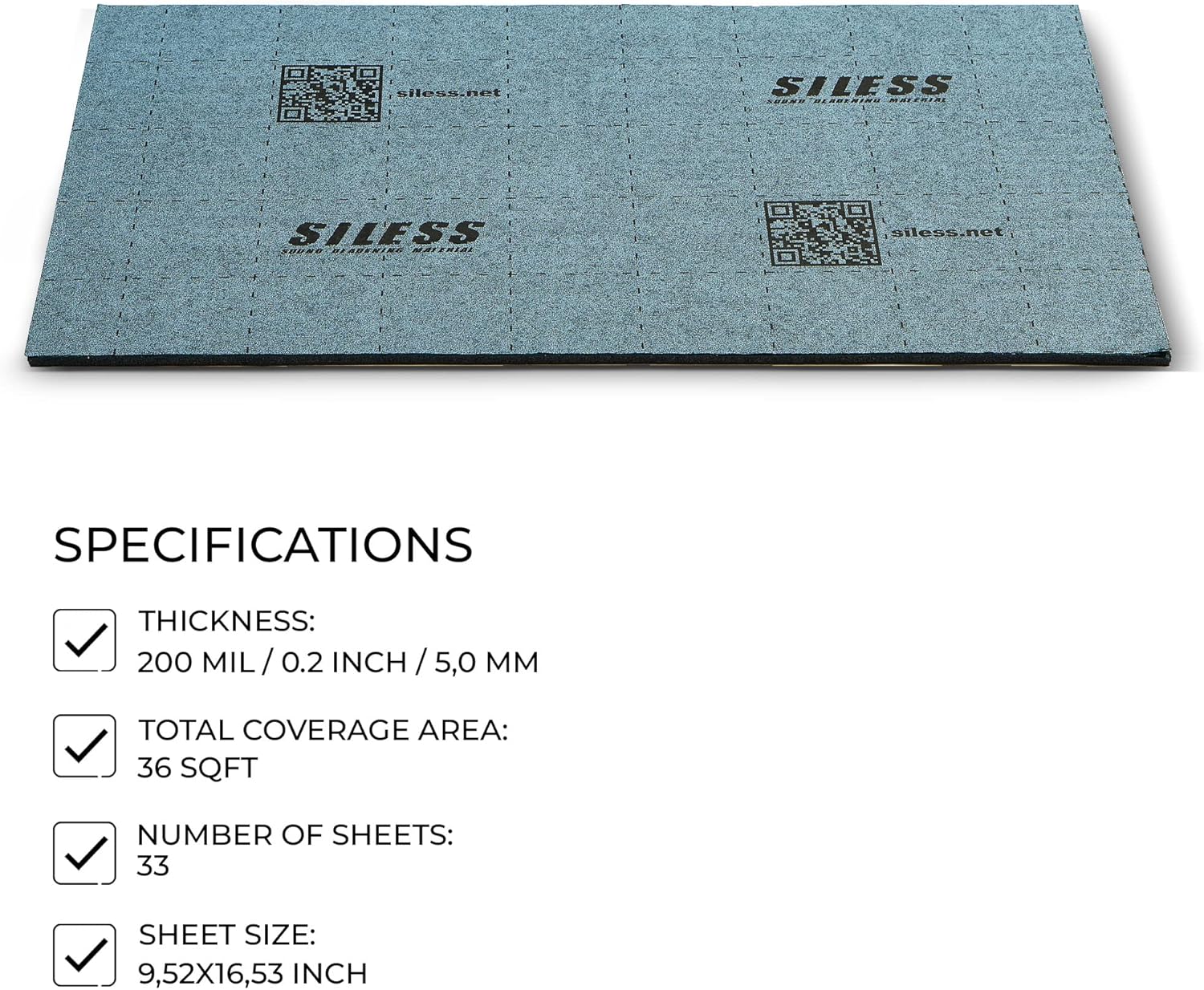 - SILESS LinerPro specifications: Self-adhesive foam sheets (closed cell PE foam) with waterproof glue. Thickness 200 mil / 0.20 inches / 5mm. Number of sheets in the package - 33. Total coverage area - 36 ft². Each sheet size - 9.52 x 16.53 inches
