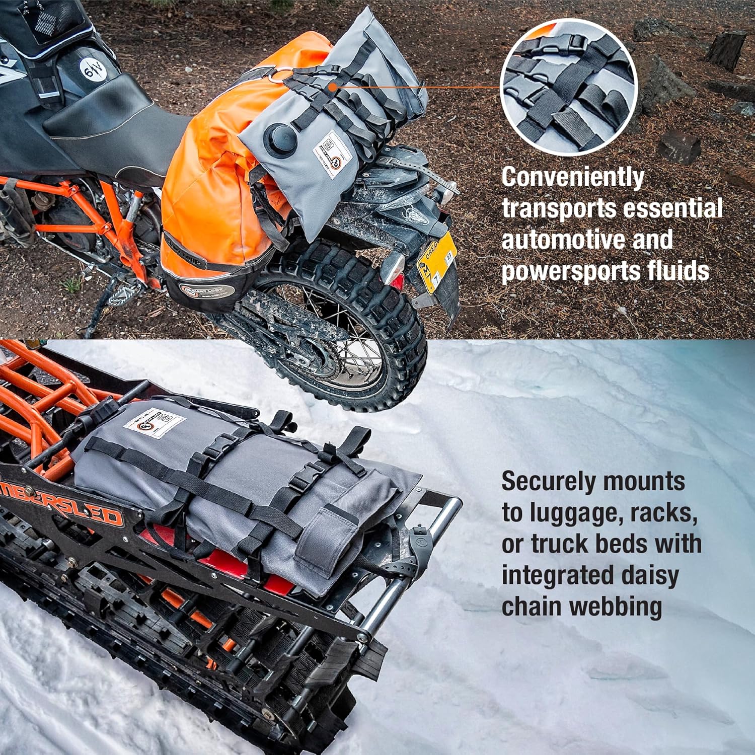 - SAFE TRANSPORT OF AUTOMOTIVE FLUIDS: Giant Loop's Armadillo Bag is a flexible, collapsible, lightweight and portable utility bladder for the safe transport and storage of liquid hydrocarbon products and other powersports and automotive fluids; It rolls up or packs flat when empty, making it convenient to carry around