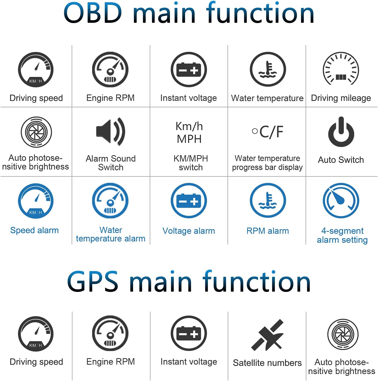 - MULTI FUNCTION DISPLAY--- In the OBD mode, it can display: speed, water temperature, voltage, driving distance, with the functions of speed alarm, water temperature alarm, voltage alarm, etc.GPS mode can display: speed, voltage, driving distance, with speed alarm , voltage alarm function. HUD can automatically adjust the brightness according to the environment. Speed unit: km / h or MPH. The unit of water temperature is degrees centigrade and degrees Fahrenheit. The unit is adjustable.