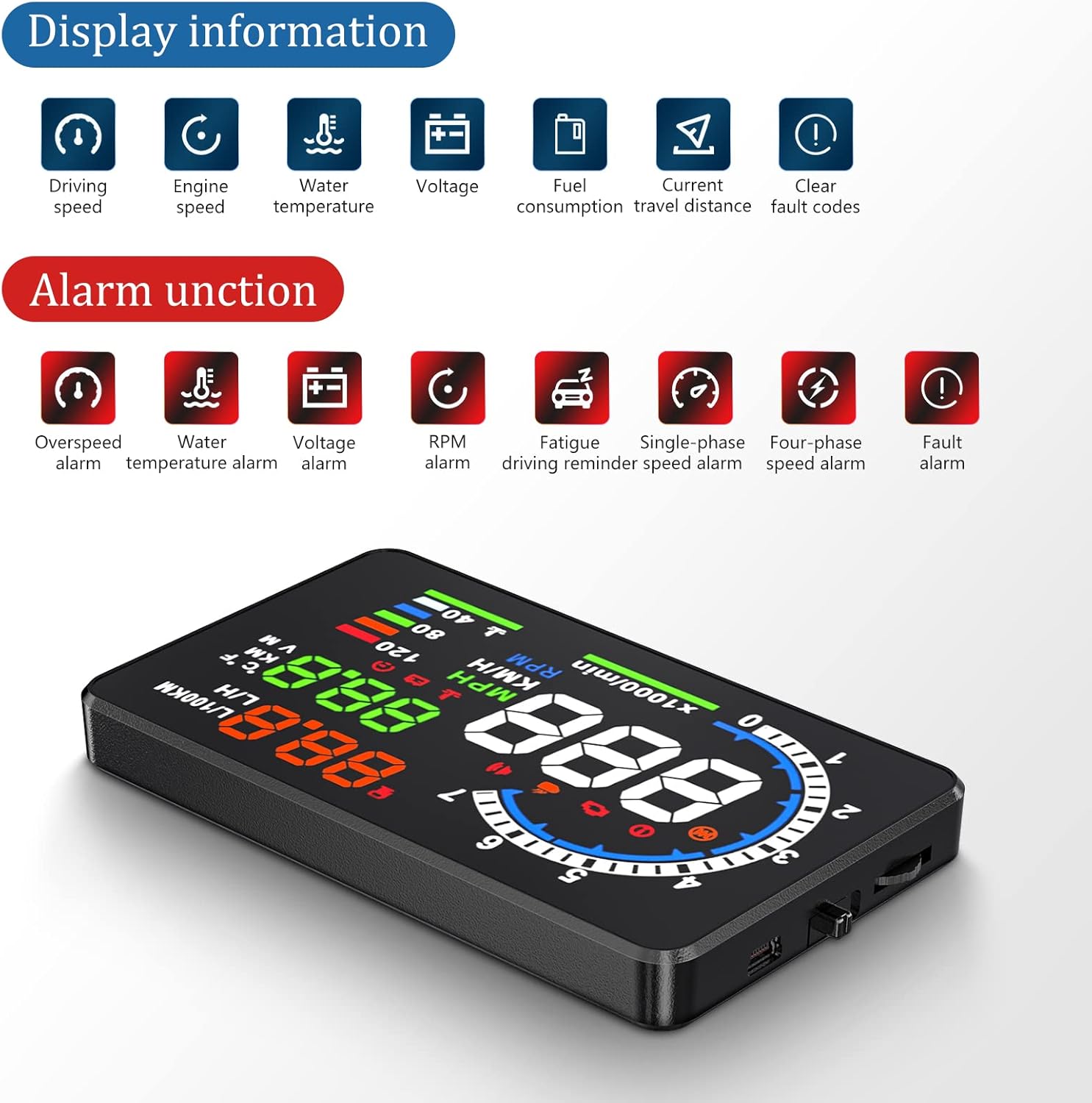 - 【LARGE HD DISPLAY】——A8 HUD is designed with an ultra-large HD 5.5-inch display, with clearer information display and multi-function switching, allowing you to monitor speed more comfortably, bringing you a better driving experience and more fun.