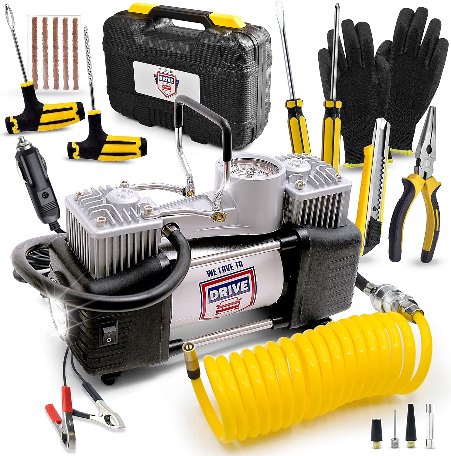 - Ultimate Tire Repair Kit for Emergencies Stay equipped for any situation with this 12 Volt Air Compressor kit. Featuring a powerful tire air pump, a tire gauge, and a professional-grade tire repair kit with plugs, this versatile set tackles any flat tire repair kit emergency. The Tire Repair Kit with Compressor offers essential tools for quick fixes, ensuring you’re ready for the road. Compact and lightweight, it’s the ideal road trip essentials for adults. Perfect to fix a flat in minutes!