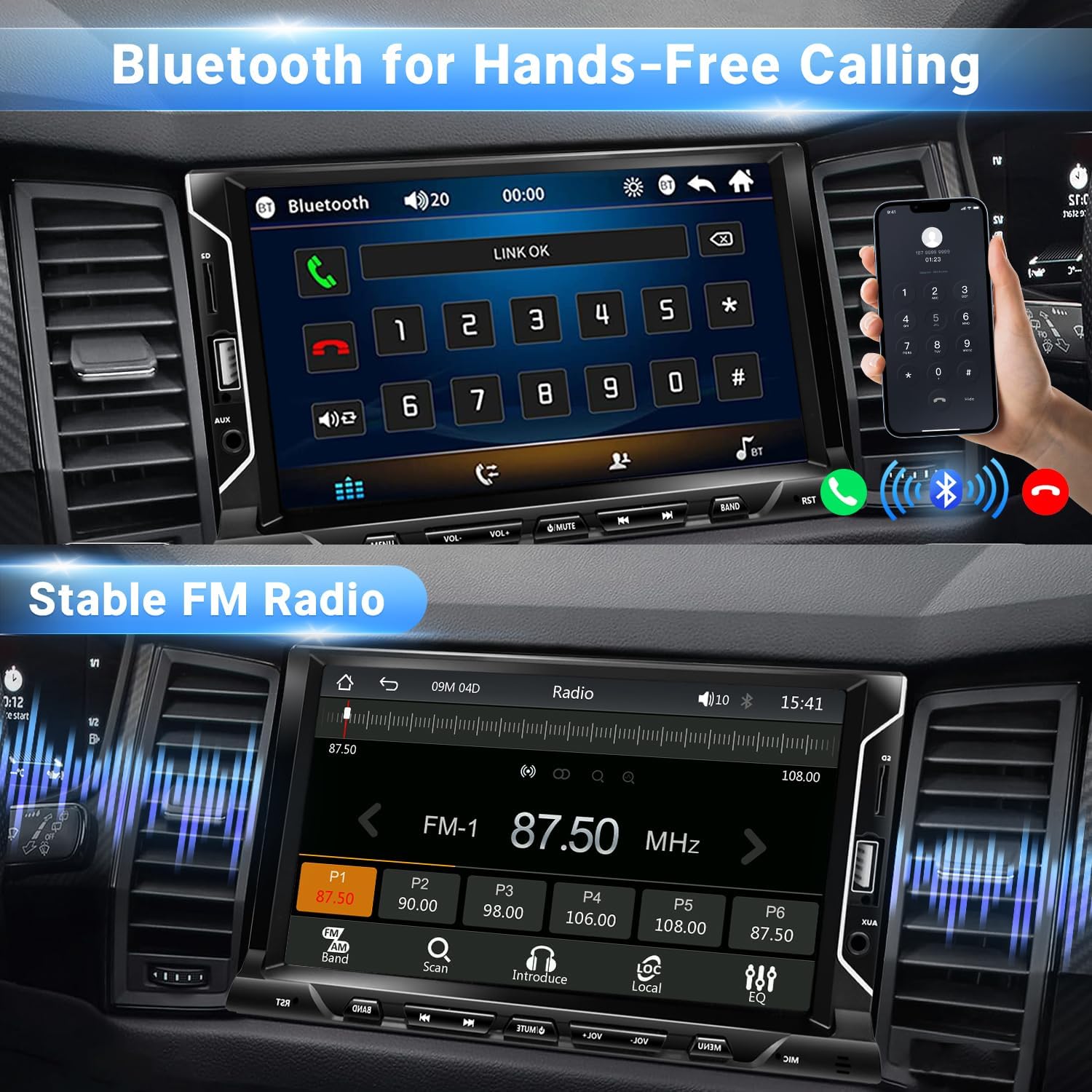 - [BLUETOOTH 5.0 CAR STEREO] No more struggling to answer your important calls while driving. The built-in microphone realizes clearer calls, never distract you from driving, ensure for a safety driving. The upgraded Bluetooth hands-free system is more stable, faster, smoother and clearer, enables wireless streaming of music, make and receive phone calls.