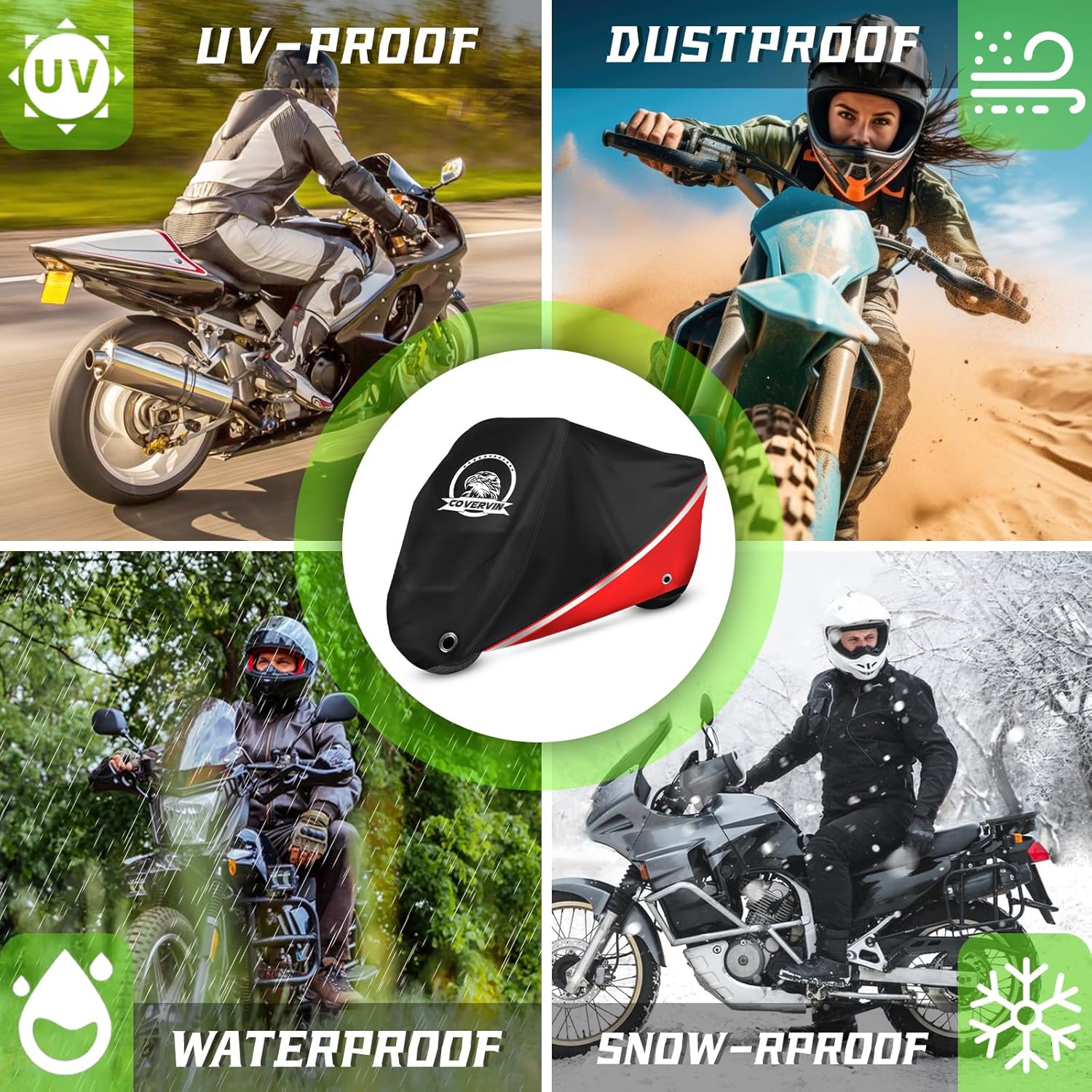 COVERVIN Motorcycle Cover, All Weather Outdoor Waterproof Night Protection with Reflective Strips, Locking Holes and Storage Bag for 91 Inch Suzuki, Kawasaki, Honda, Harley-Davidson(Red L)