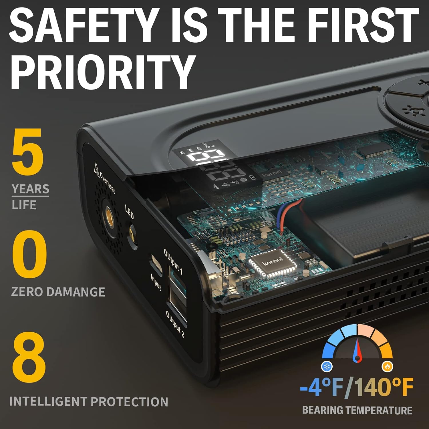 - 【LATEST QDSP TECHNOLOGY】With the same starting battery capacity, our jump box equipped with the latest QDSP technology has 3-5 times the current of the old jump starter. At the same time, through the subversive innovation of the battery/assembly structure, the start-up temperature is reduced by 50% to achieve temperature balance and escort your safety.