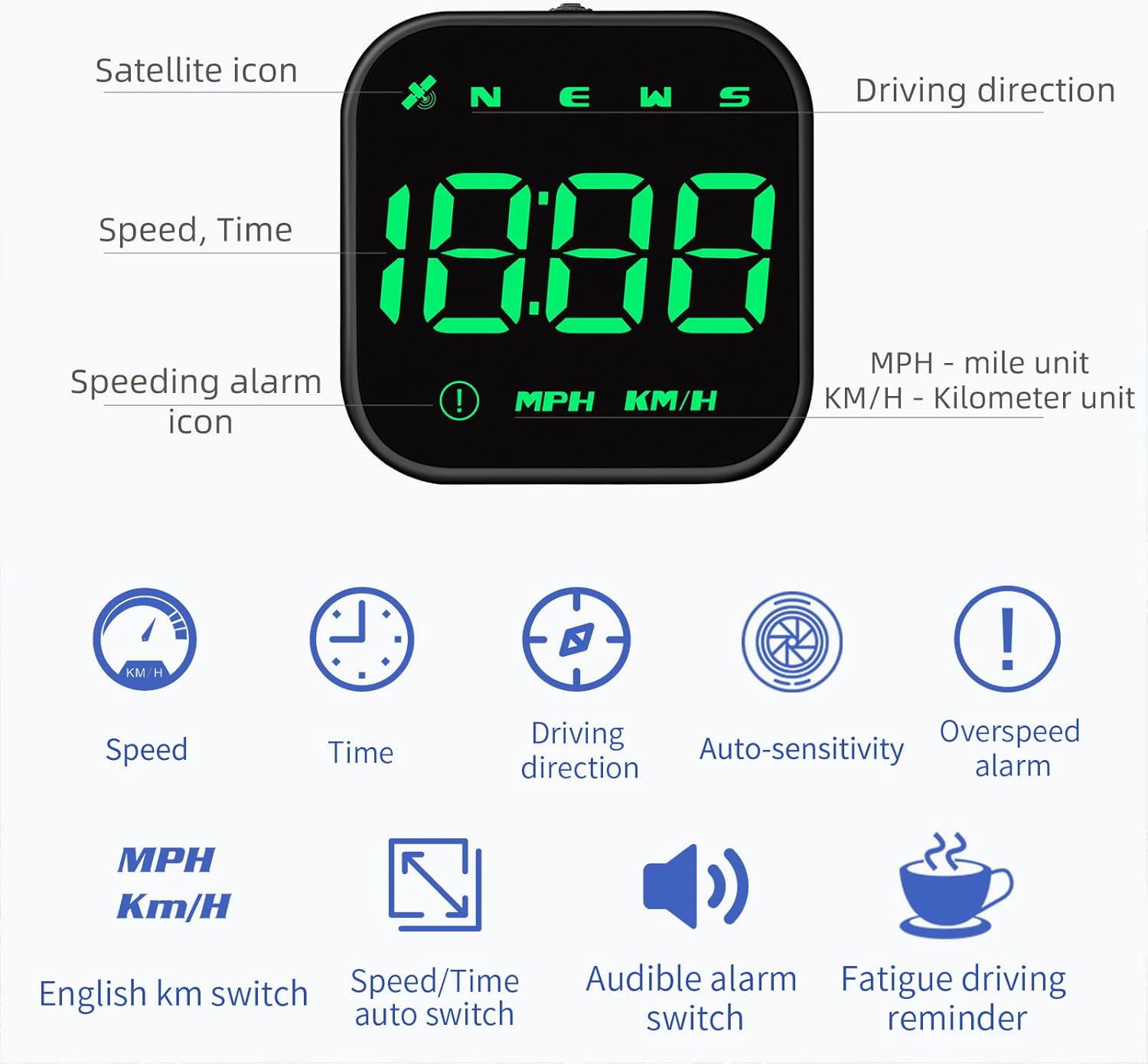 - 【RICH FUNCTION 】 Vehicle speed, driving direction, number of stars, freely switch between kilometers and miles, speeding alarm, fatigue driving reminder.Multi function display One-click switching.