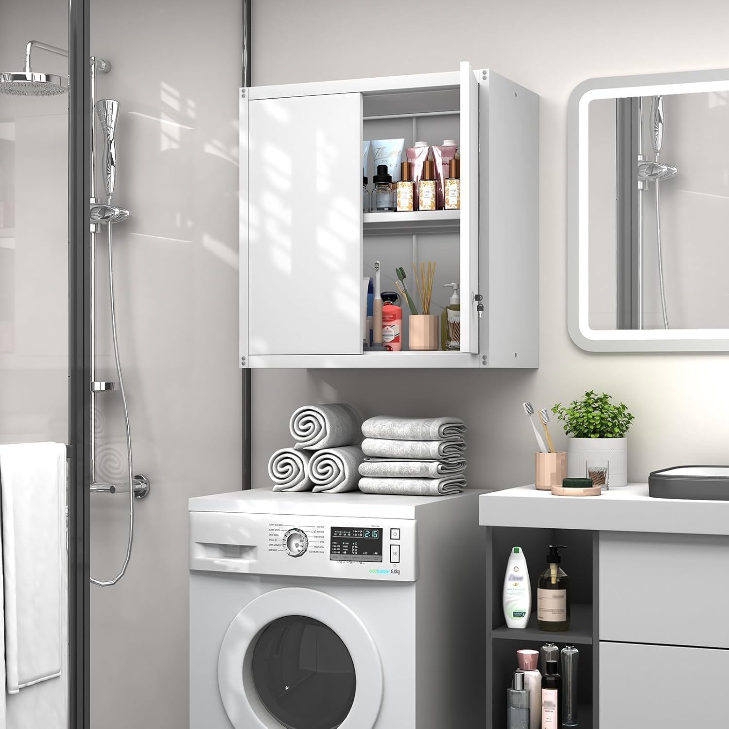 GREATMEET Metal Wall Cabinet, Wall Mounted Storage Cabinet with Lock for Garage Storage, White Floating Cabinet with Doors and Adjustable Shelf for Utility Room