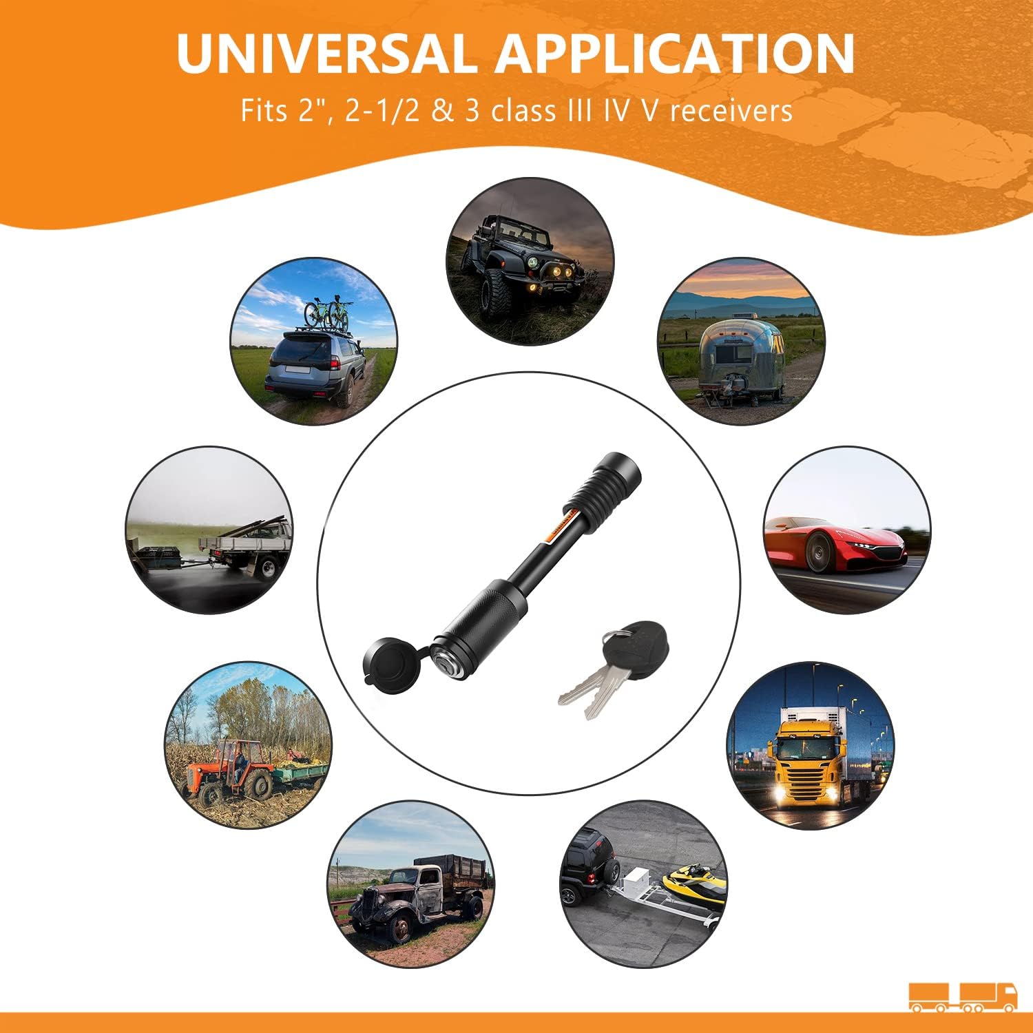 - 【UNIVERSAL COMPATIBILITY】- 5/8" diameter with 4” long trailer hitch locks fits most class III IV V 2" 2-1/2", 3" & 3-1/2" hitch receivers. The hitch lock also can be used for tray tow rope of trailer, truck, car, bike and boat.