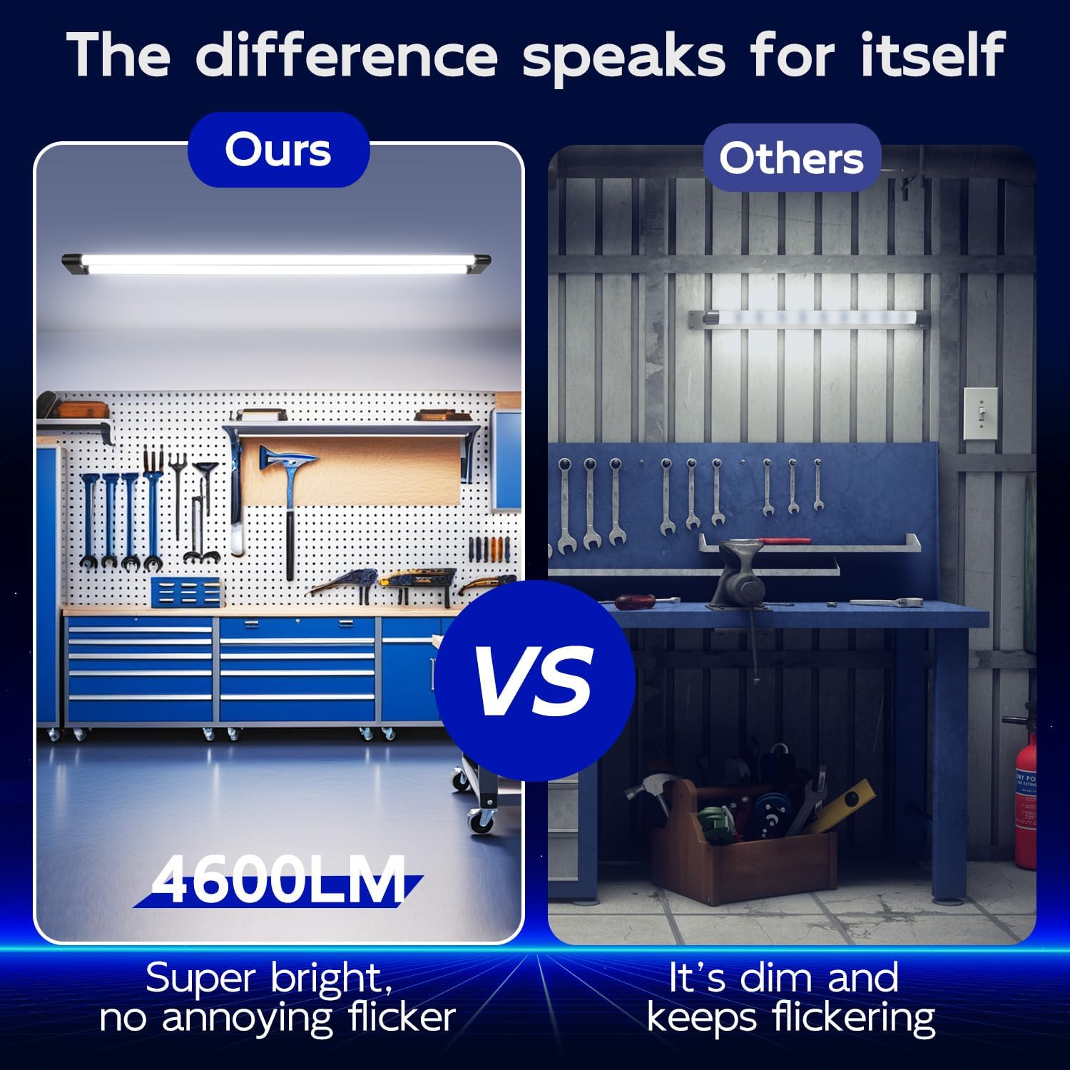 - Linkable Design : Easily connect up to 6 pcs of these 4ft linkable LED shop lights using the plug connection. Create a well-lit environment in your garages, workshops, workbench areas, storage areas, warehouses, basements, and equipment rooms.