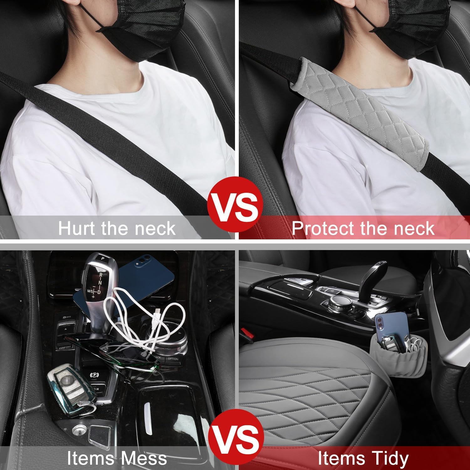 - Universal Size & Extra Accessories: 1 Pack Car seat cover is suitable for most cars. The car pocket organizer is compact and can be attached anywhere. It is perfect for storing small items such as phones, glasses, keys, change, and data cables. Seat belt cover, soft and comfortable, makes your driving experience very comfortable, perfect for cars, trucks, backpacks, luggage shoulder straps, etc.