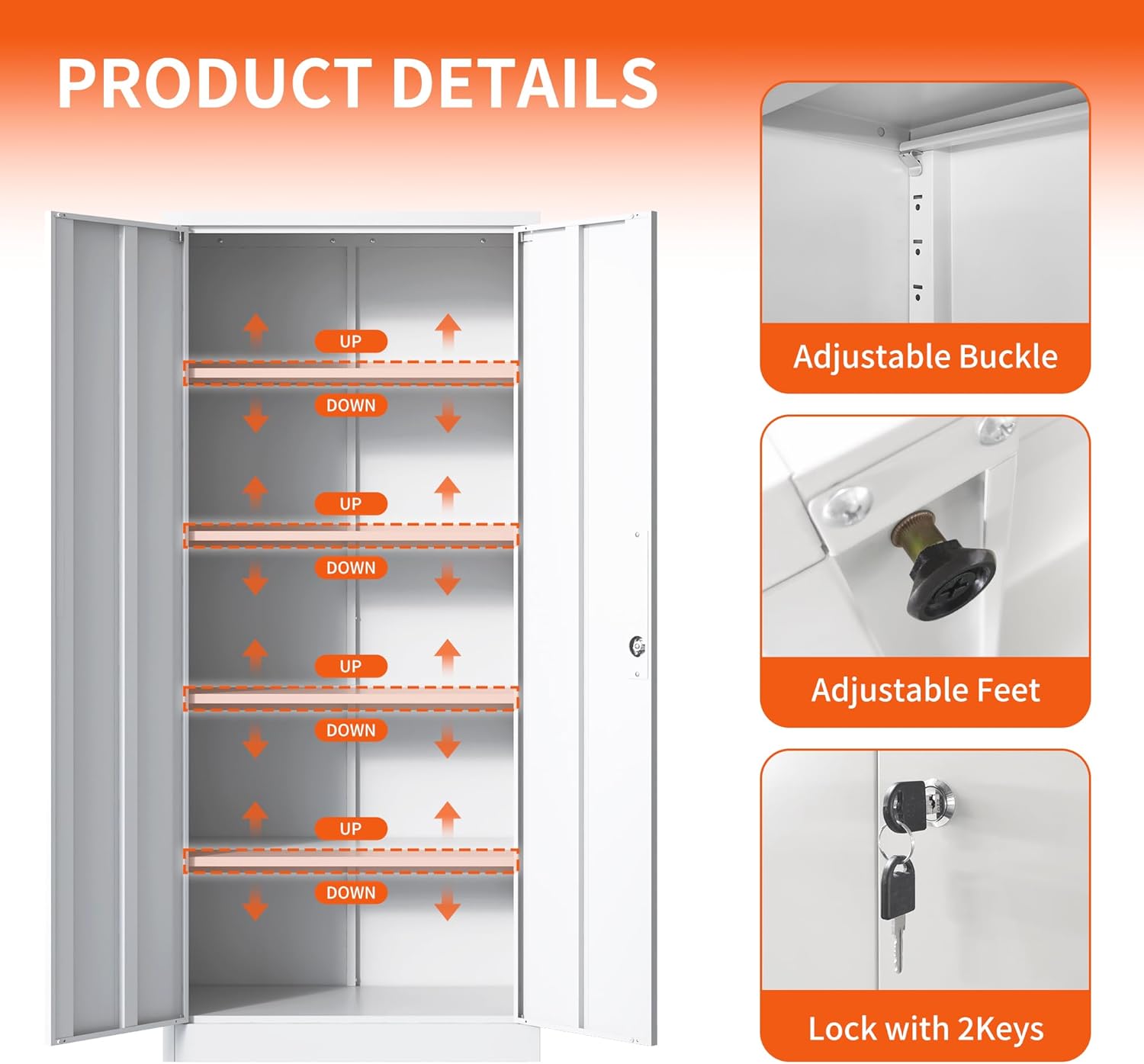 - 【Durable & Strong Constructure】The storage cabinet with doors and shelves is made of reinforced steel frame which is rugged and not easily deformed, the max weight capacity each shelf is up to 121lbs, surface adopted environmentally powder coated finish, Moisture proof and rust.