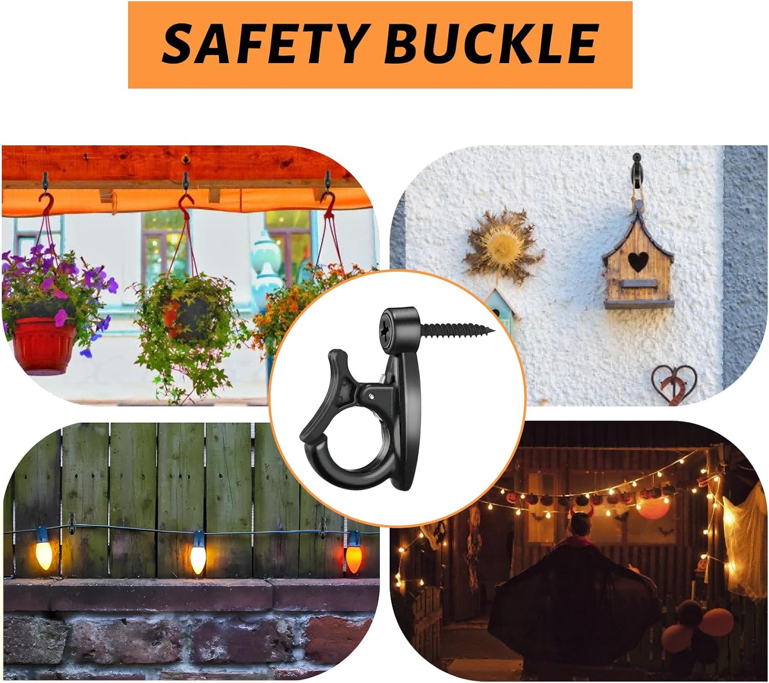 - 【Snap-on Buckle Design】String light hooks are designed with spring self-locking snap buckle that remains closed and locked until it is intentional opened for disconnection. Snap hook can effectively prevent your hanging object form falling down.