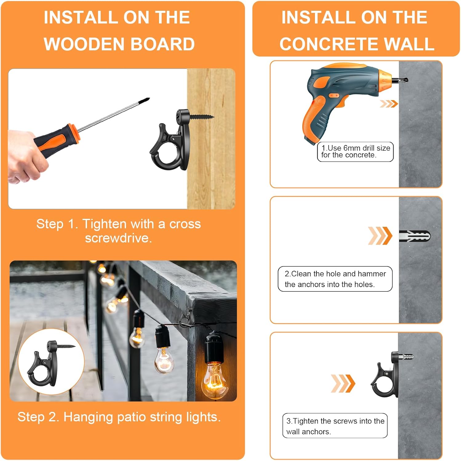 - 【Easy Installation】Christmas rope lights hanging hooks set is easy to install. You can use a phillips screwdriver to screw the nail into the wooden beams, tree, fence, eaves etc. And for concrete or brick walls you can pre drill a hole then put a plastic tube into the hole, then tighten the screw into the plastic tube.