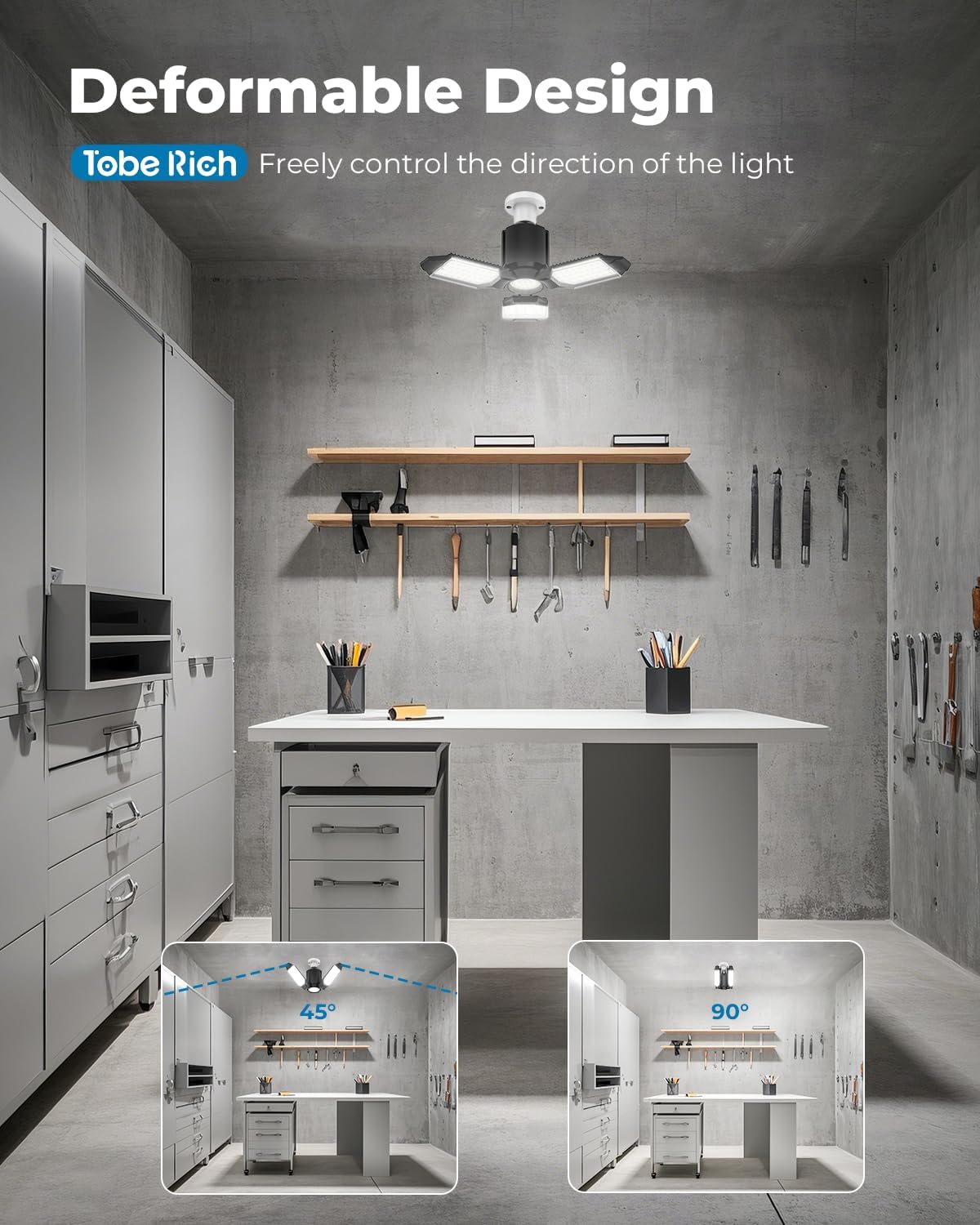 - šæššš¤š§š¢ššš”š šæššØššš£: Our deformable LED garage lights feature adjustable panels that can be angled up to 90 degrees, allowing you to customize the direction of your lighting to suit your needs. Besides, with a wide-angle and multi- panels design, these garage LED lights provide broad coverage, illuminating even the darkest corners of your garage or workshop