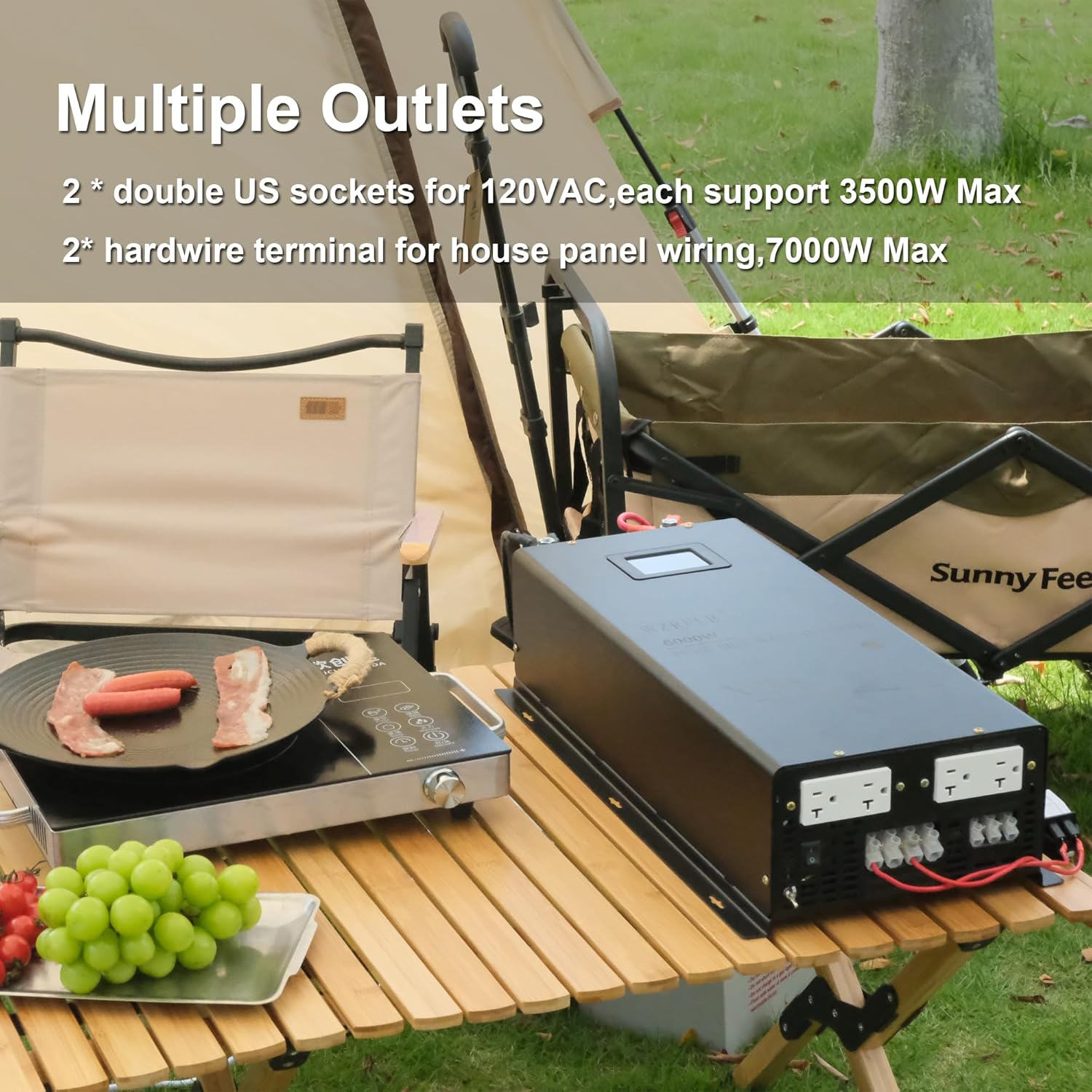 - FEATURES: 2 circuit 120v AC outputs with 4 AC outlets ,each circuit can support 3500W output at the same time ,one circuit 240VAC with max 7000W output ,one AC hardwire terminal with Multiple output (L1+L2=240V, L1+N=120V, L2+N=120V )