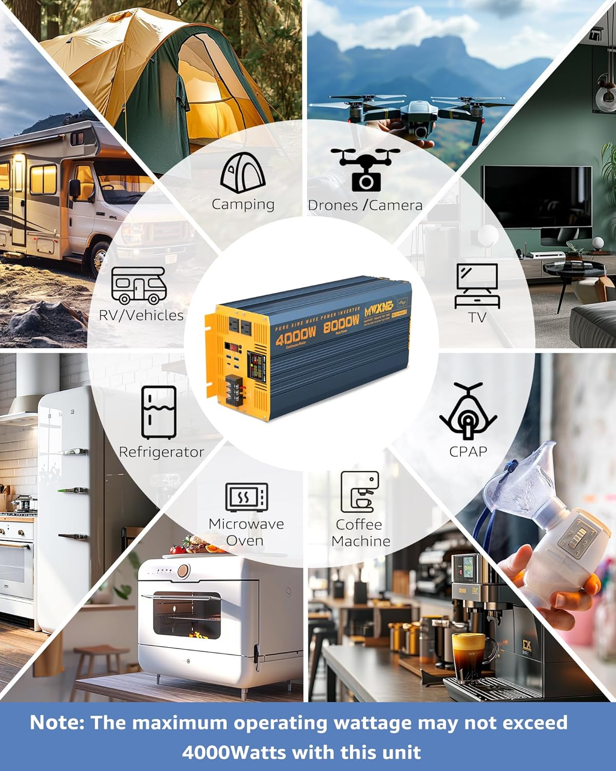 4000W Pure Sine Wave Power Inverter DC 12V to AC 110V 120V for Home RV with Dual AC Outlets 1 USB-C(60W) 3 USB-QC3.0 Fast Car Charger Adapter, LCD Display and Remote Control