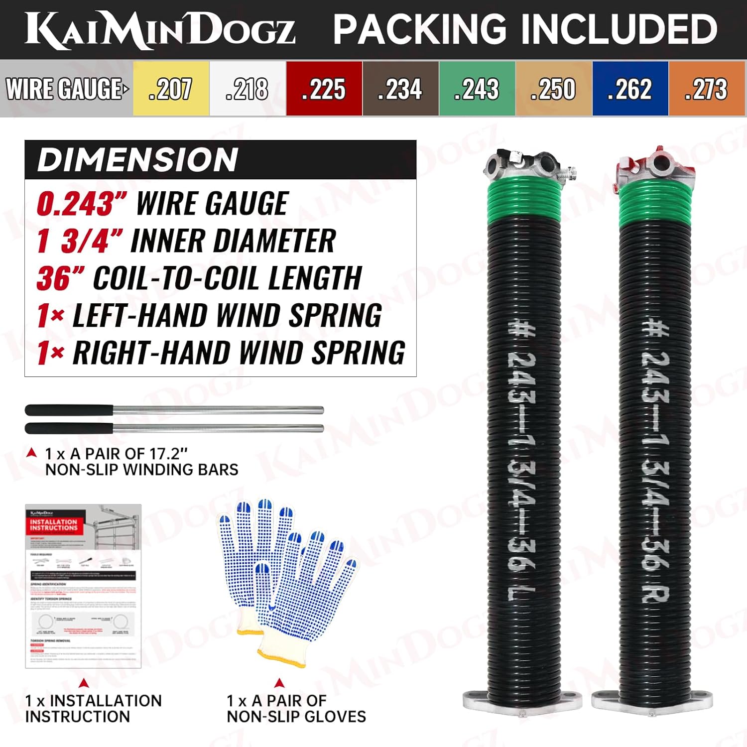 - PACKING INCLUDED : A pair of Garage Door Torsion Spring, A pair of 17.2’’ Non-Slip Winding Bars and Gloves, and Installation Instructions are included in the package, so you can start installing immediately after receiving the product.