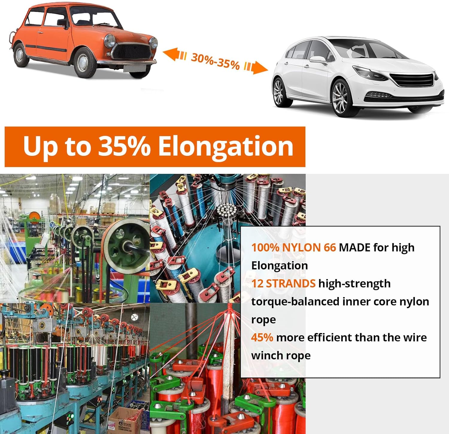 - Premium Material & Higher Elastic Elongation: Crafted from 100% nylon 66 for extended durability.12-strand high-strength torque-balanced nylon inner core provides exceptional resilience and wear resistance, outlasting 8-strand recovery tow ropes. Up to 30%-35% stretch capacity, the ideal choice for safest and smoothest vehicle recovery from mud, sand, or snow, offering impact-free towing that leaves your vehicle unscathed