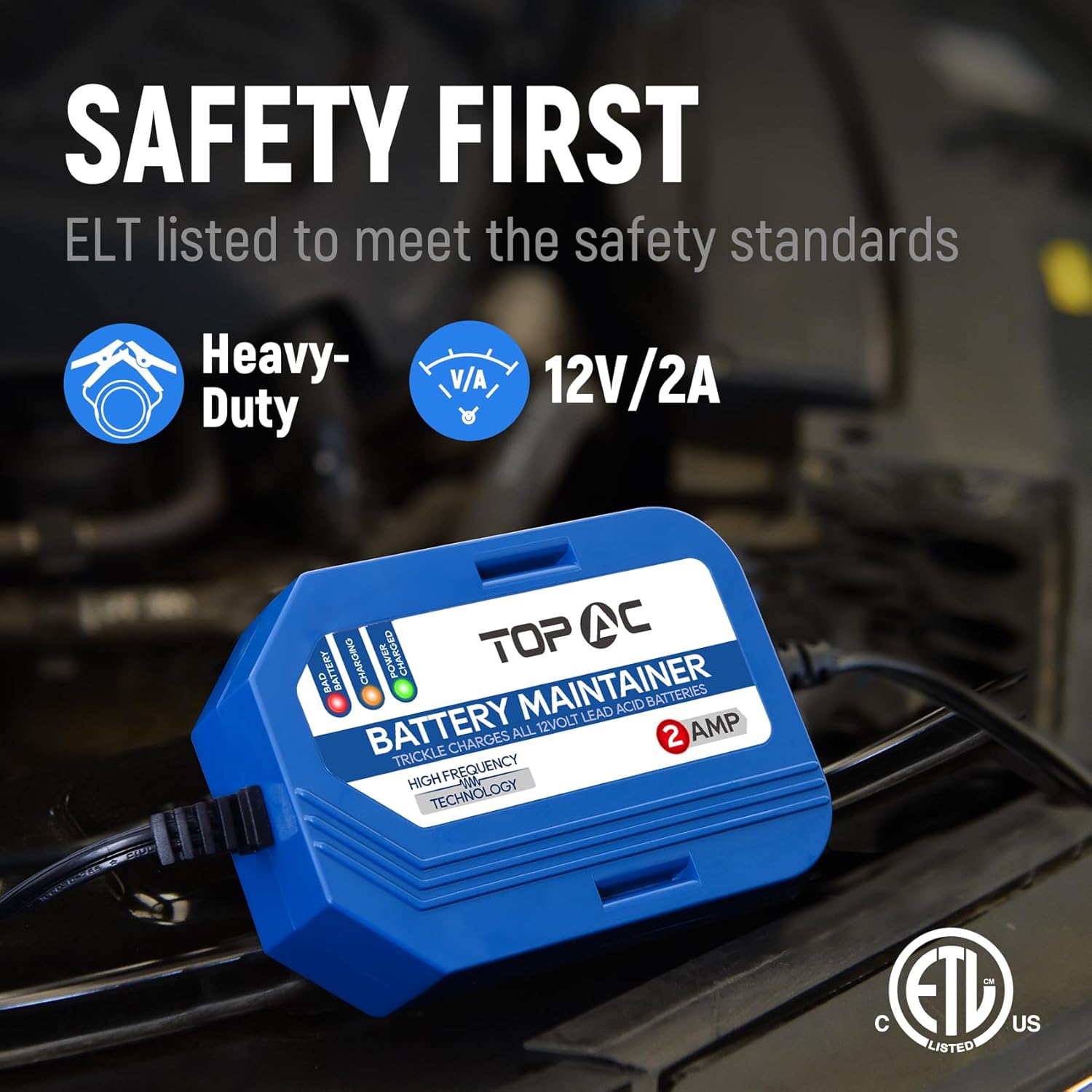 - Poratable & Compact: Measuring just 5*3.5*1.38 inches in size, the TOPDC 2 Amp Car Battery Charger is compact and easy to store in your car or in your home