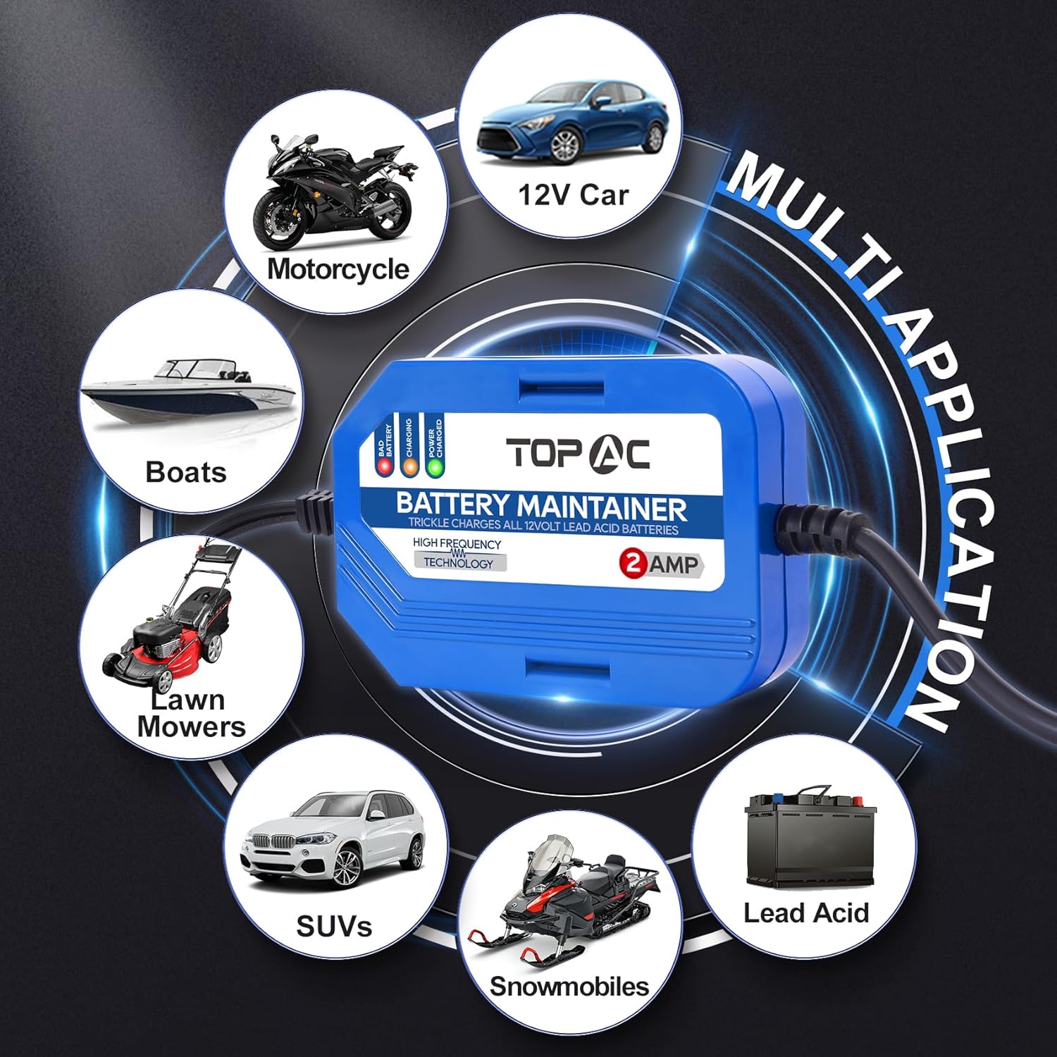 - Automatic Charging: 12V 2-Amp 3-stage battery charger. During charging, our maintainer will keep the batteries in the best conditions, automatically adjust the charge rate as battery becomes charged, and stop when the battery is fully charged