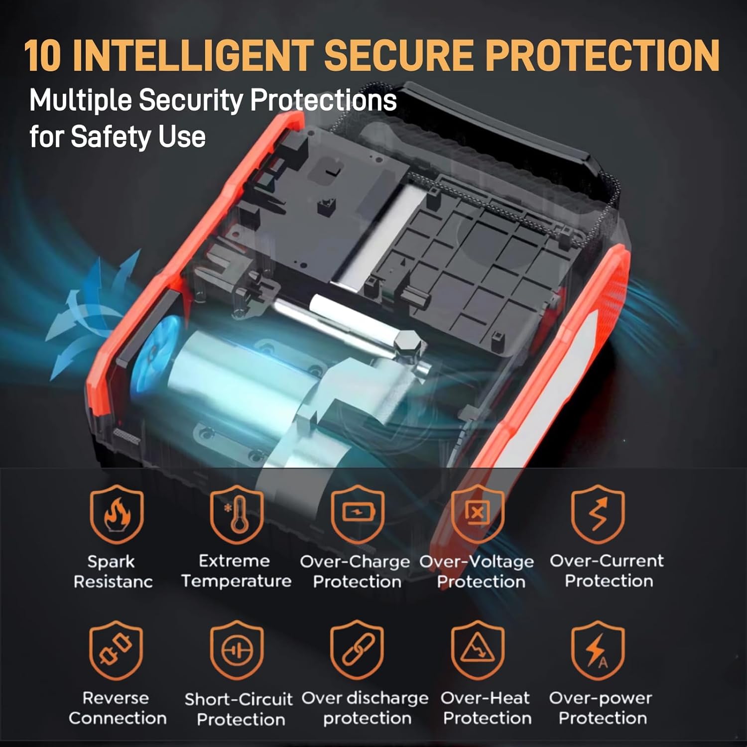 - ENHANCED TERMAL MANAGEMENT & SAFE OPERATION: Featuring with advanced assembly and a unique honeycomb thermal design, this jump starter with tire inflator reduces start-up temperature by 50%, greatly boosting inflator durability and extending service life by over 30%. This jump start pack has a timely visible alarm with automatic 10-level protection ( (reverse polarity, reverse charge, over discharge, reverse connection, short circuit, over charge, over current, over heat, spark resistance) to fully protect you and your car from any improper handling