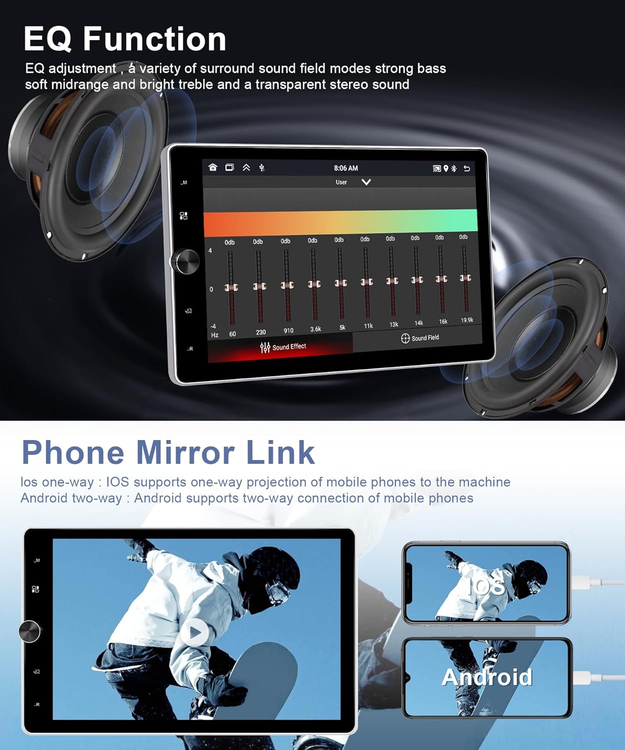 - 2.【10.4‘’Motorized Touch Screen & 50UIs】:To have a comfortable look and feel,our 10.4-inch large touch screen provides a wider and clearer view,the electrically rotatable screen allows for adjusting the angle and position to suit your preferences,ensuring an optimal visual experience.Single din touchscreen with 50 colorful UI Theme for your choice