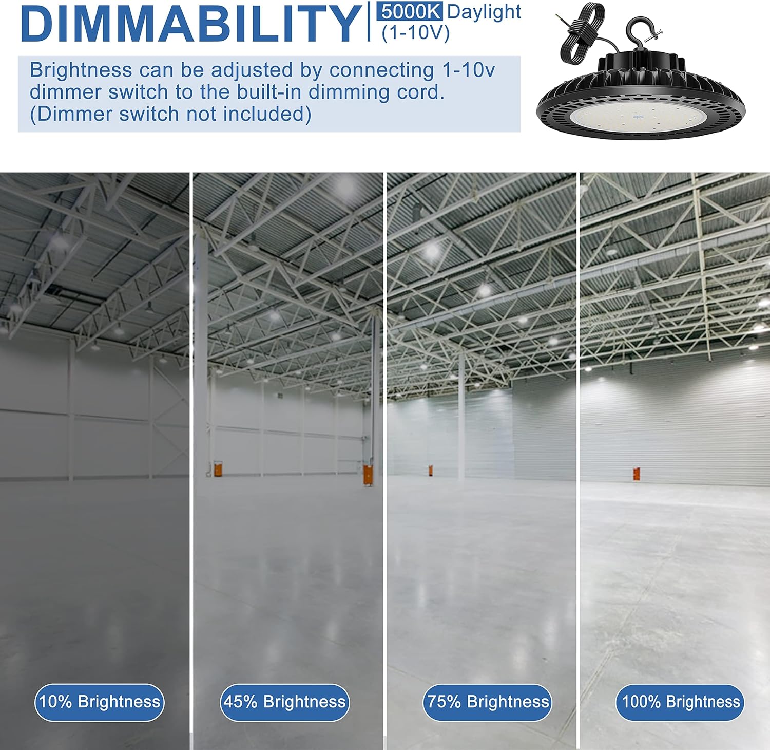 - βDimmable & Crazy Bright: YELLORE 300w led ufo high bay light have a 0-10V seamless dimming function, any suitable brightness for your choice. It supports 100-277V input voltage and 41000 lumens output, where the brightness is up to 140LM/W, provides 5000k lighting effect. Moreover,the led ufo light use advanced SMD 3030 chips and color rendering index Raβ₯80.