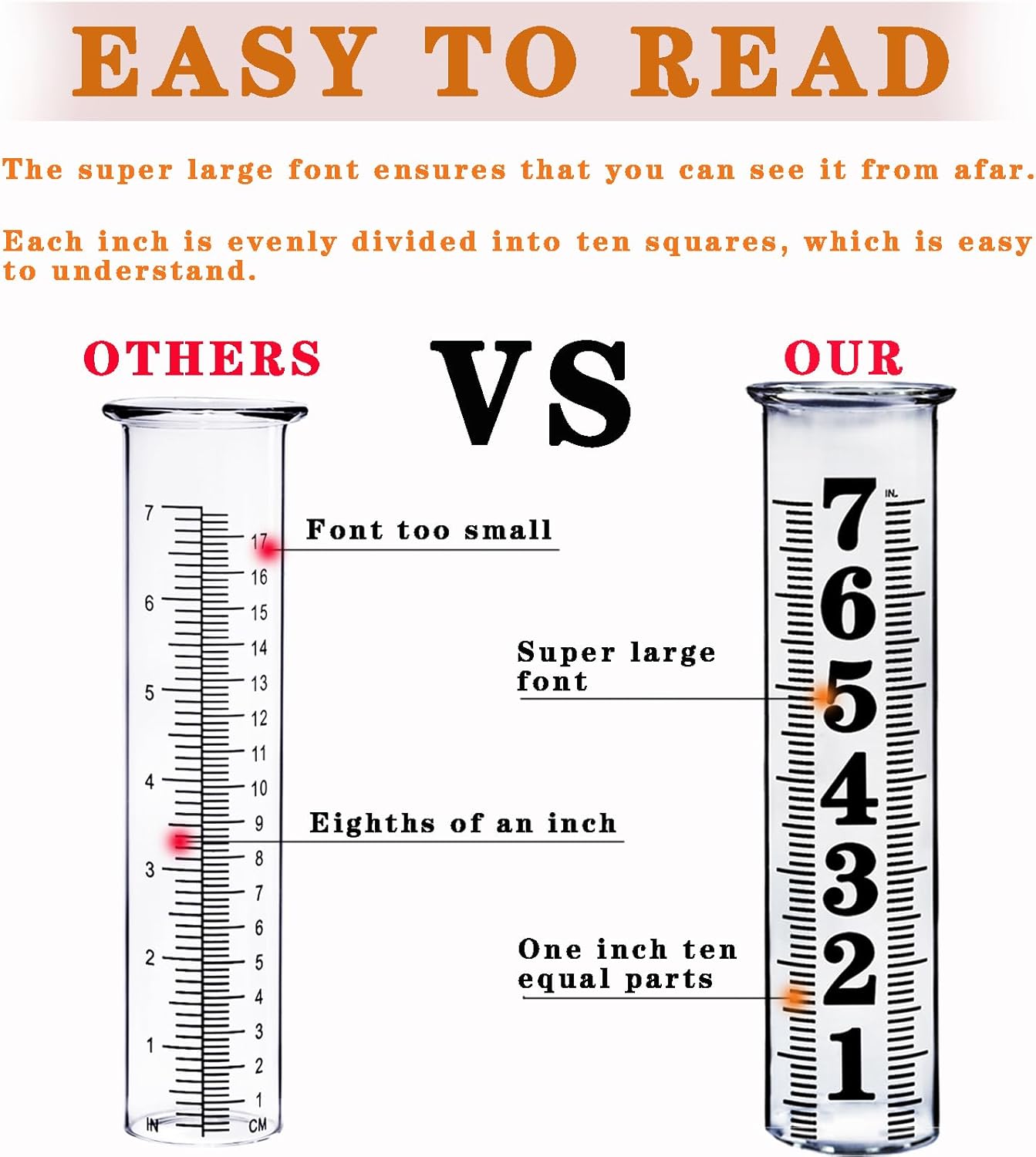 - 【Clearer and Easier to Read】The scale on the decorative rain gauge outdoor tube is upgraded to large font, which is more accurate,clearer and easier to read.