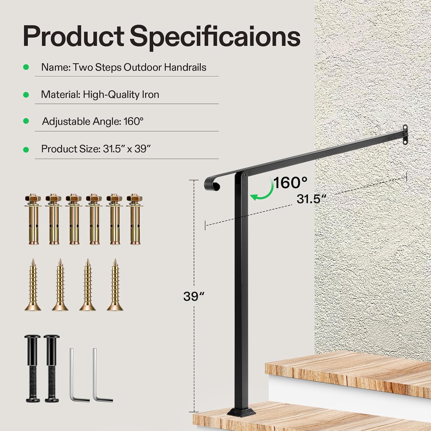 - Sturdy & Durable: Made of premium iron for stability and durability, this handrail can withstand harsh weather conditions, including rain and snow; Thick black powder coating reduces chance of peeling off, rust, scratches, and discoloration, making the railing easy to maintain and clean