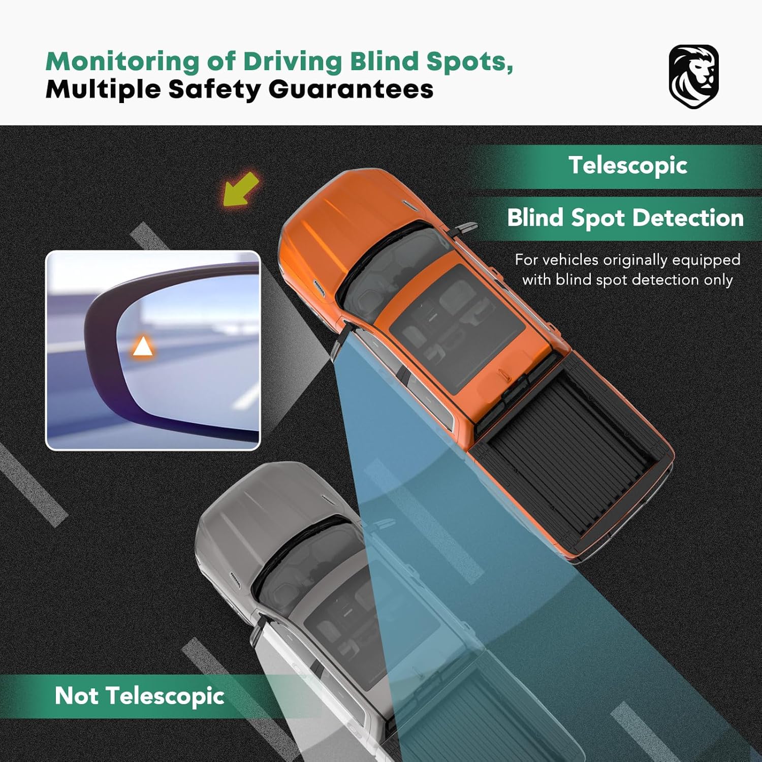 - Incredible Functions: ①Power adjusted for in-car angle adjustment (powered flat mirror, manual convex mirror); ②Power heated for quick defogging or defrosting in cold or wet weather; ③Blind spot detection detects and warns of side and rear blind spots; Plug-and-play multi-function car mirrors with manual telescoping and folding for a safer, more confident journey