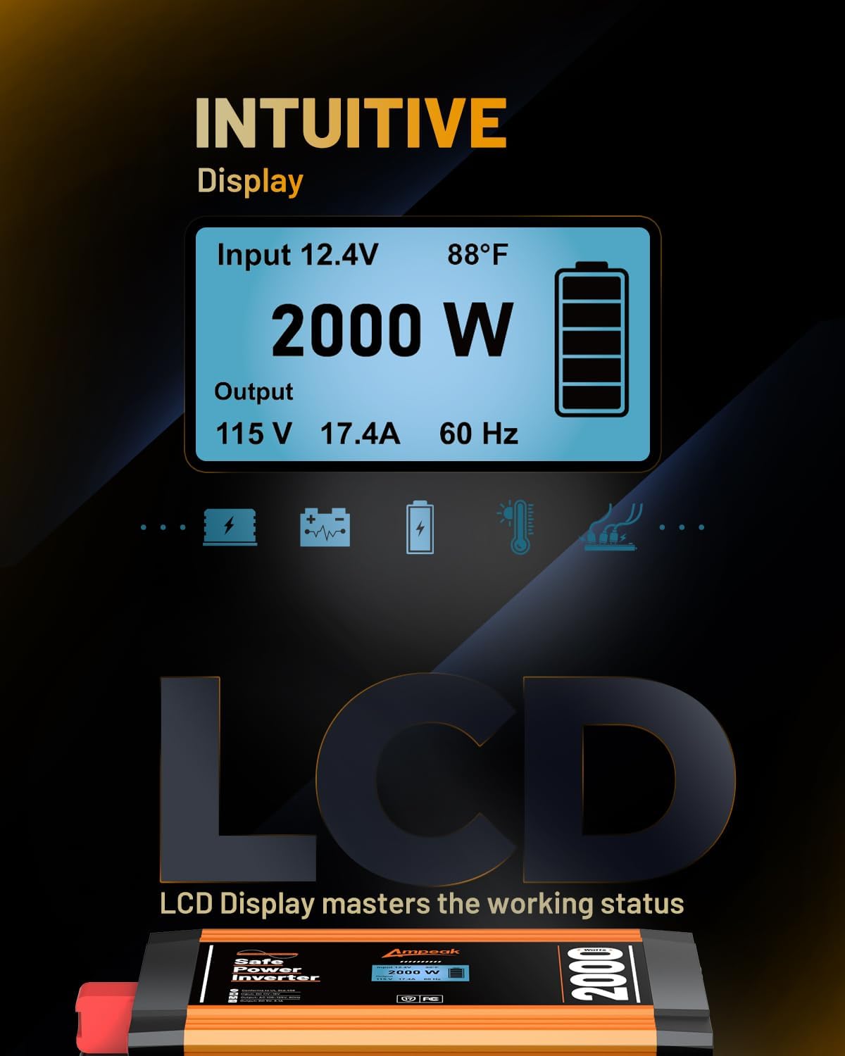 Ampeak 2000W Pure Sine Wave Inverter 12V DC to 120V AC LCD Display Power Inverter 17 Protections 3AC Outlets Dual 5V/3.1A USB Ports for Emergency Backup