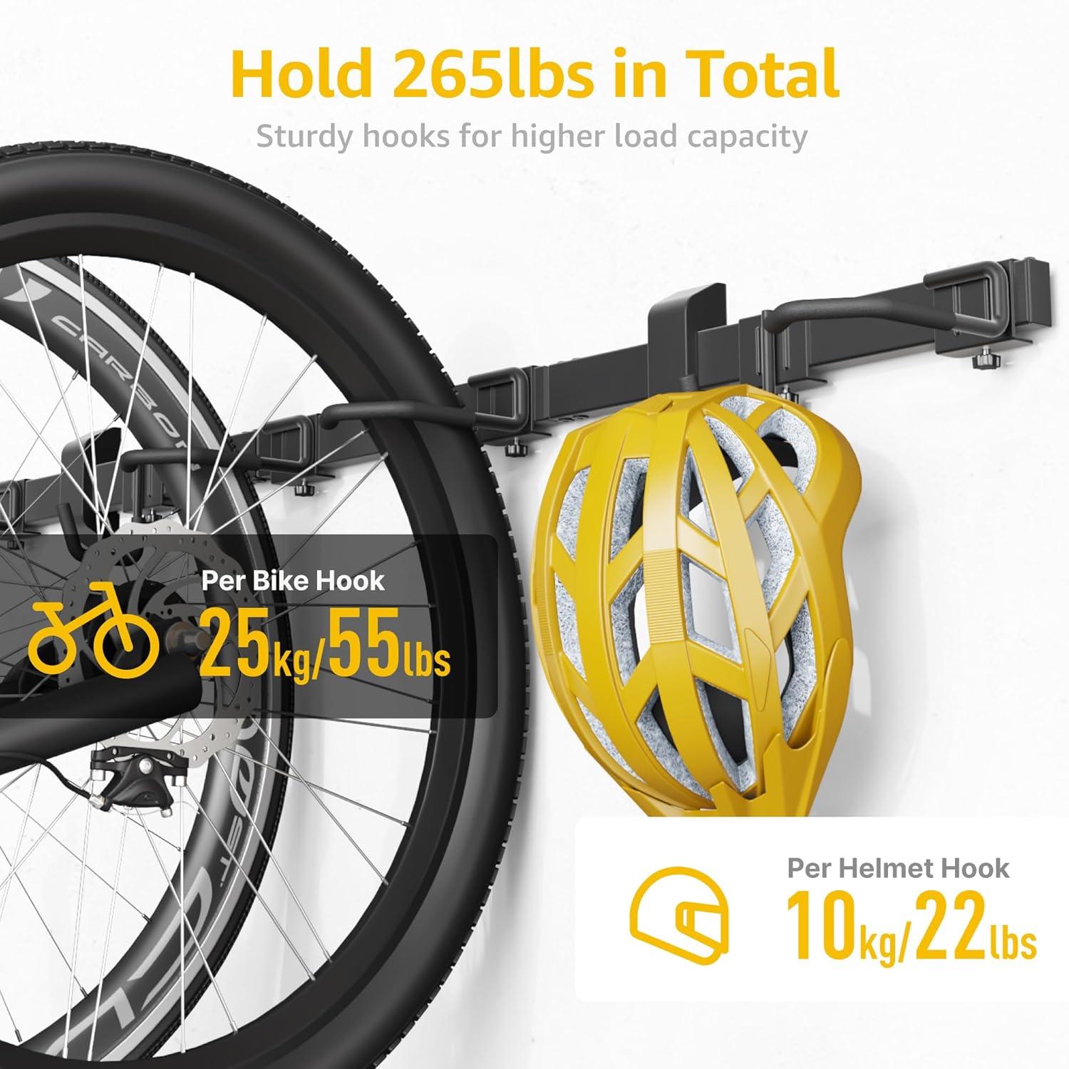 - 【STURDY & DURABLE STRUCTION】 Discover the unbeatable strength and longevity of monTEK's Bike Wall Mount. Engineered from premium steel, its unique and robust structure guarantees exceptional durability. Unlike other market wall bike rack prone to bending, our garage bike rack promises peace of mind by preventing bent rails, bike drops, or wall damage. With each bike hanger able to support up to 55 lbs and each helmet hook bearing 22 lbs, our bike wall hanger supports a total of 265 lbs, providing a secure and reliable storage solution you can trust.