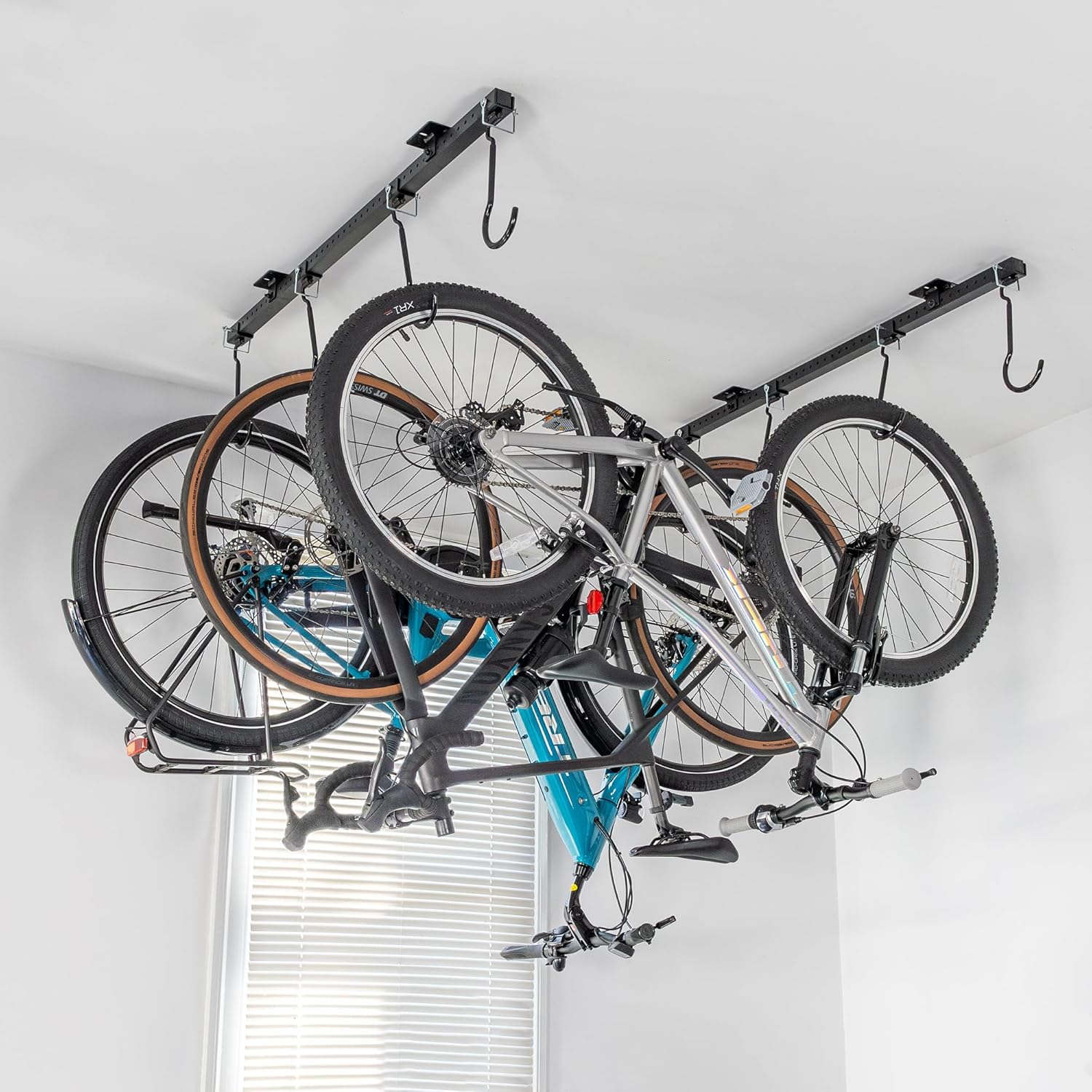- Maximize Garage Space with our Ceiling Bike Rack: Transform your garage into a clean, organized haven with our premium ceiling bike rack. Designed for efficient bike storage garage solutions, this innovative bike ceiling mount system holds up to 8 bicycles, including mountain bikes, road bikes, e-bikes, and kids' bikes, freeing up valuable floor space while keeping your bikes secure and easy to access.