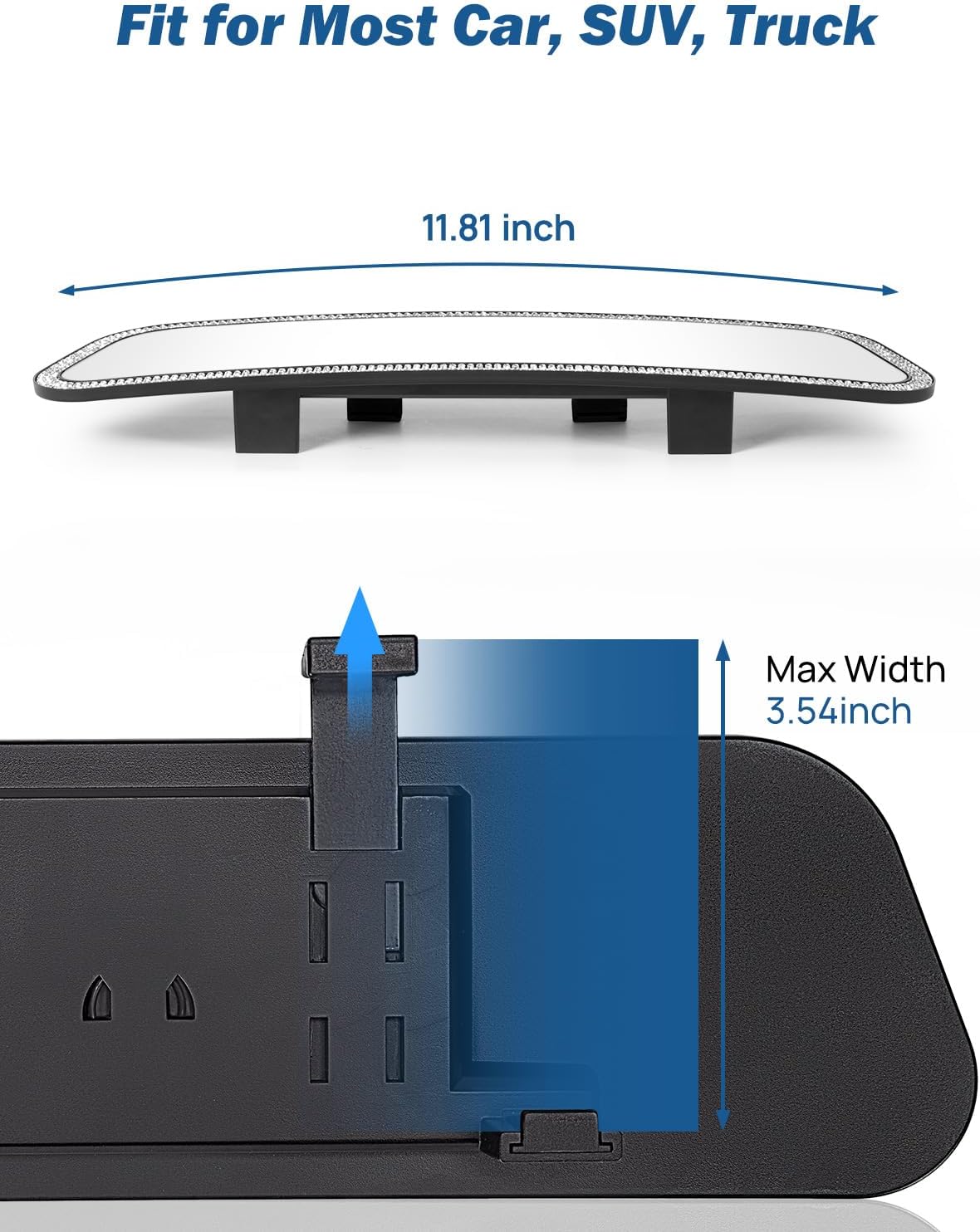 - UNIVERSAL: The size of this interior mirror with diamonds is 11.81 x3.1 inches, longer than most rearview mirrors, which means can offer you a wider field of view than others and car clip-on design fit universal vehicles, like a car, SUV, CRV, Vans, and Truck