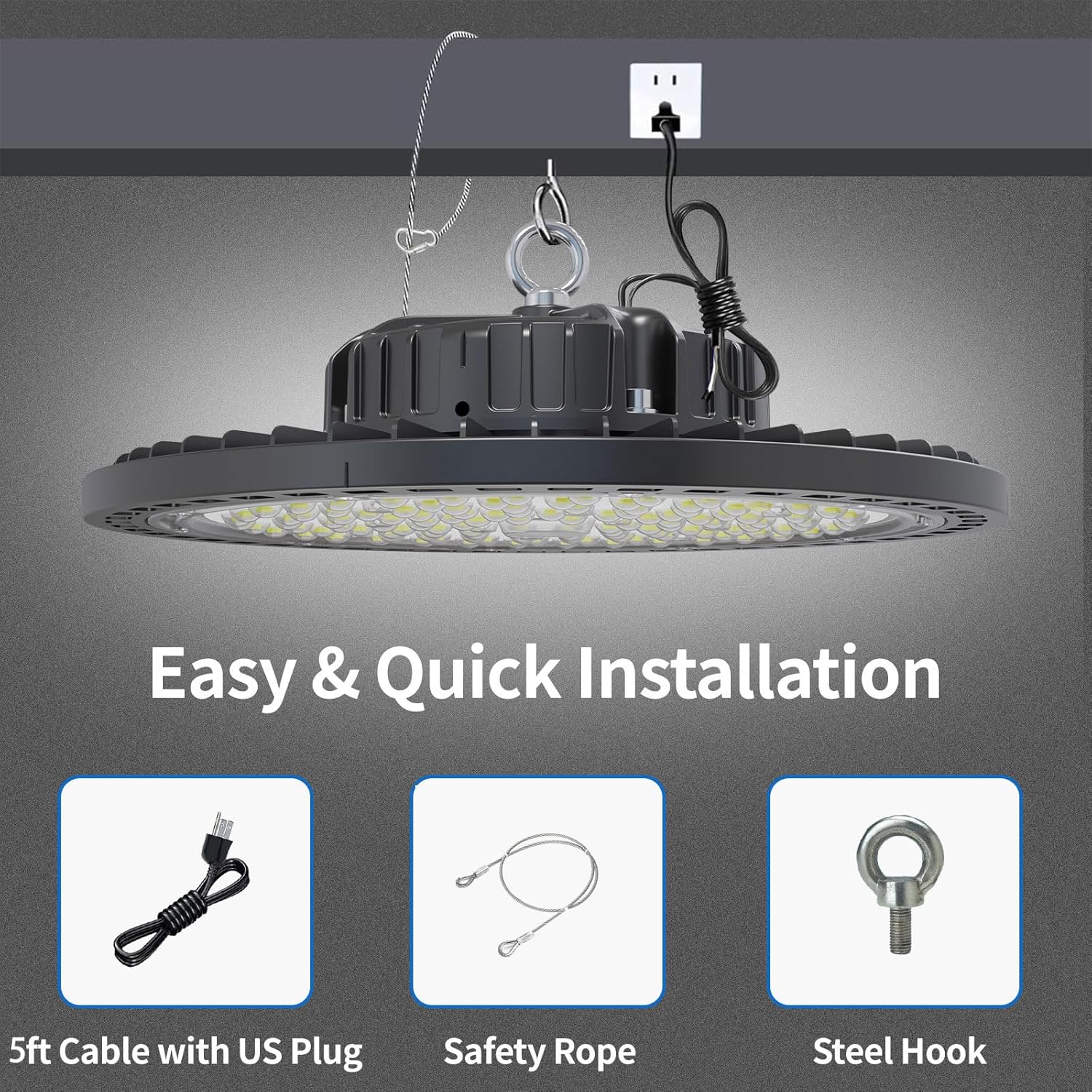 - 【Simplified Installation】Includes 5ft UL-listed cord + US plug + safety cable. Mounts in minutes without electrician - compatible with most commercial bay lighting setups