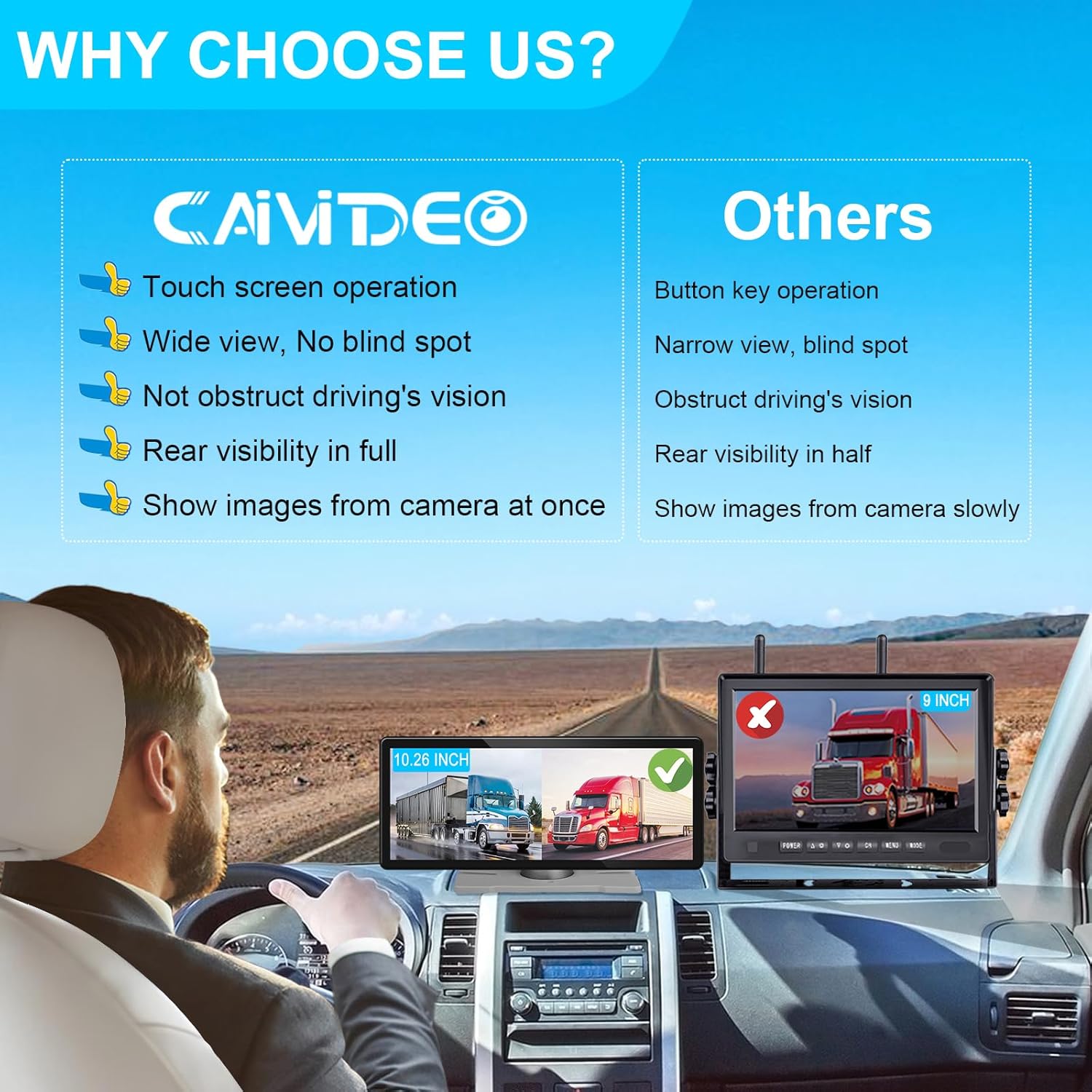 - Touch Operation: Caivideo 10.26" wireless back up camera for truck has no key button and use touch screen to settting the menu and operate the monitor easily. You can easily setting the monitor, such as system time and language, guide line, brightness, auto-brightness, contrast, volume, color, display mirror, auto cycle record and playback the video. The monitor offer 4 different mirror images and 6 different display modes, and you can touch select mirror or display mode according to your needs.