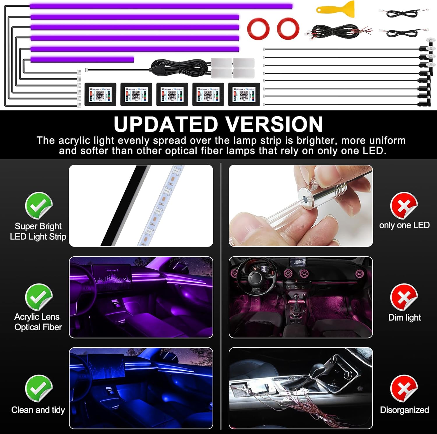 - 【High Bright & Uniform】The Acrylic Car Ambient Interior Lighting have super bright LED and acrylic lens and contains 6 LED strips (4*29.5inch+1*43.3inch+1*14inch), Foot well lamp*4(44.5inch*2/64.9inch*2) and Door handle light*4+doors storage box light*4 (21.6+21.6inch), also comes with 1 main controller and 4 sub controllers,and can be flexibly installed on any car by DIY without disorganized, which is plug and play, and this acrylic light evenly spread over the lamp strip is brighter, more uniform and softer than other optical fiber lamps that rely on only one LED.