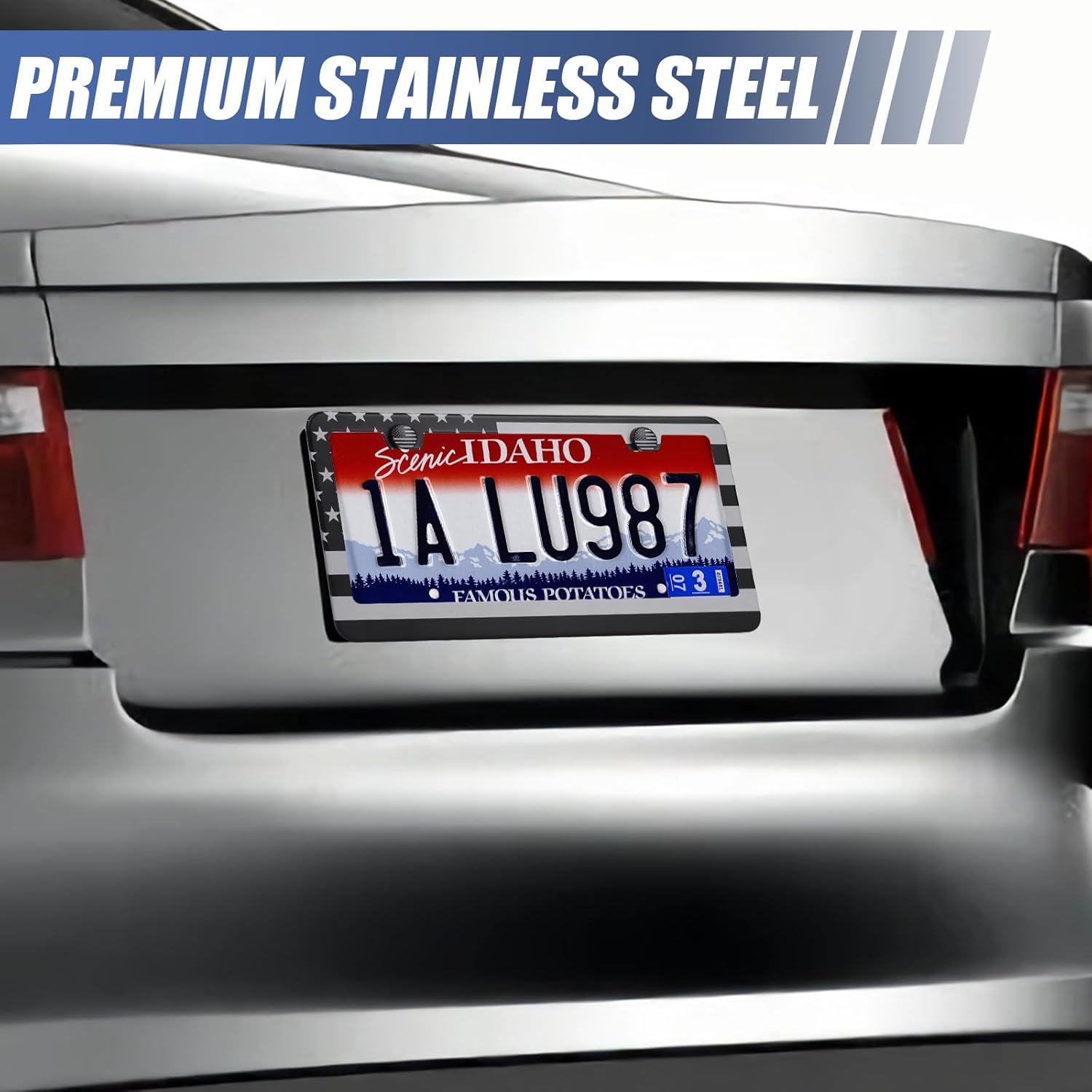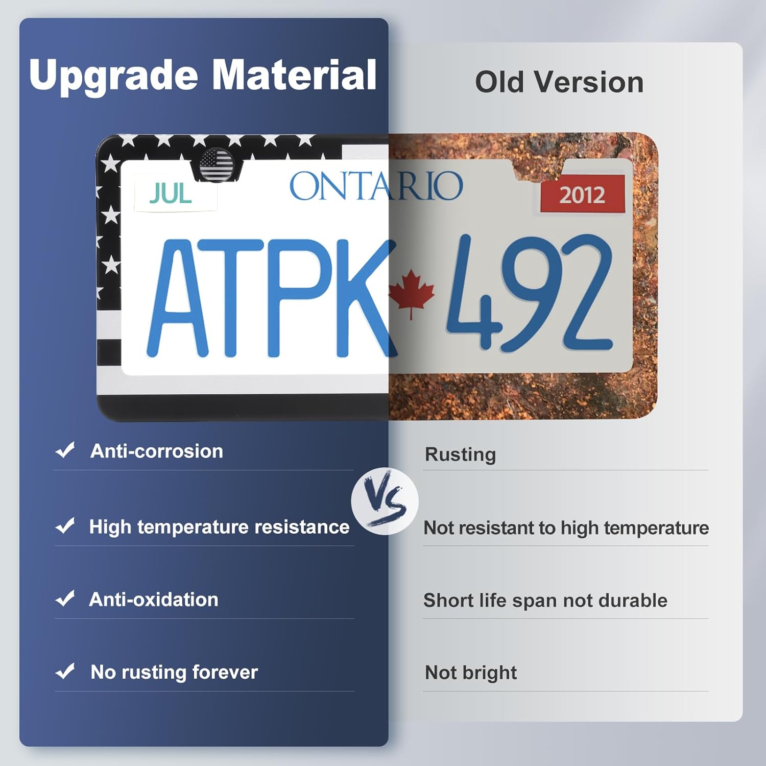 - STAINLESS STEEL LICENSE PLATE FRAME: The main characteristics are no rust, corrosion resistance, air and steam resistance. Wear-resistant, waterproof, not afraid of high temperature, easy to deal with all kinds of bad weather, avoid light pollution, easy to maintain.