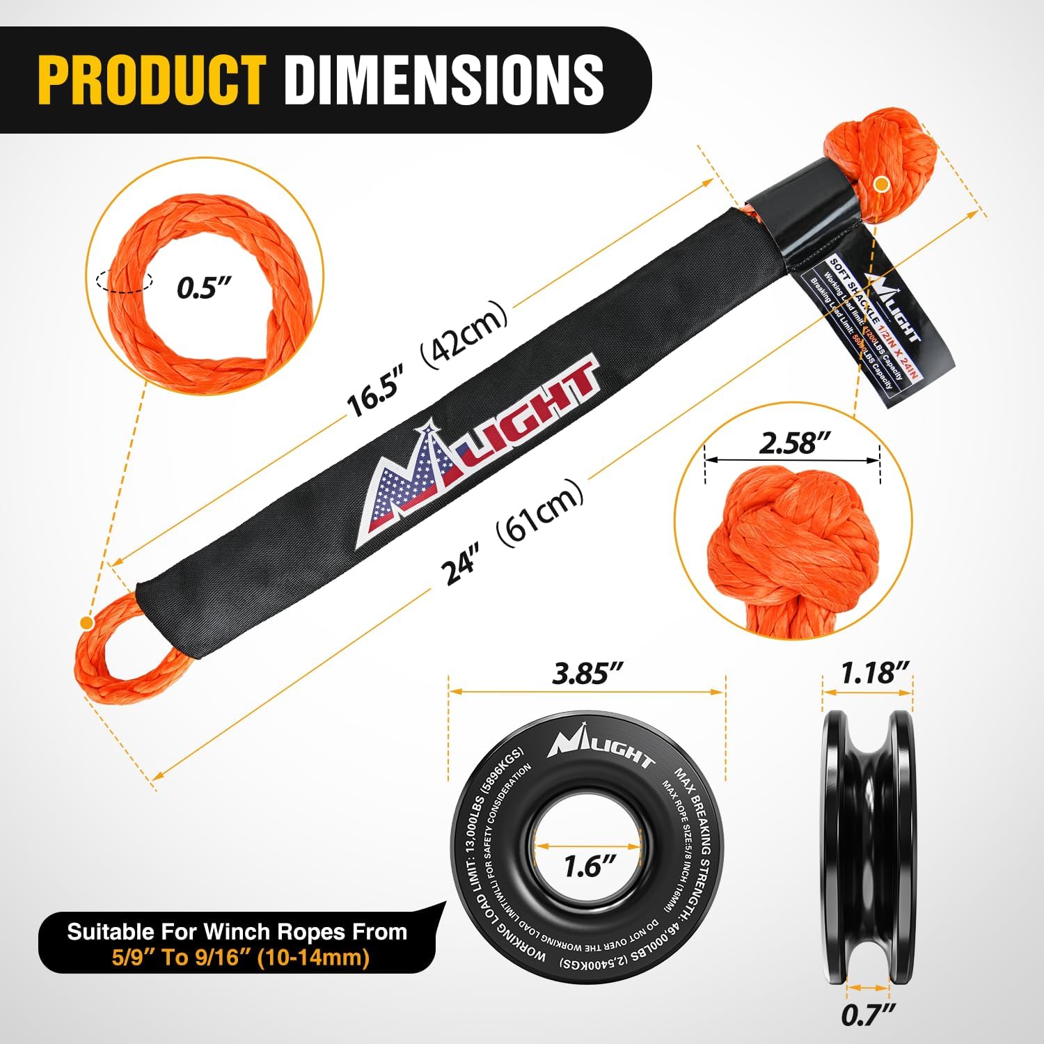 - 【Package Included】- 1PCS 1/2" x 24" Synthetic Soft Shackle, 1PCS Snatch Ring. The packaging is specially designed to avoid your package being damaged during transportation