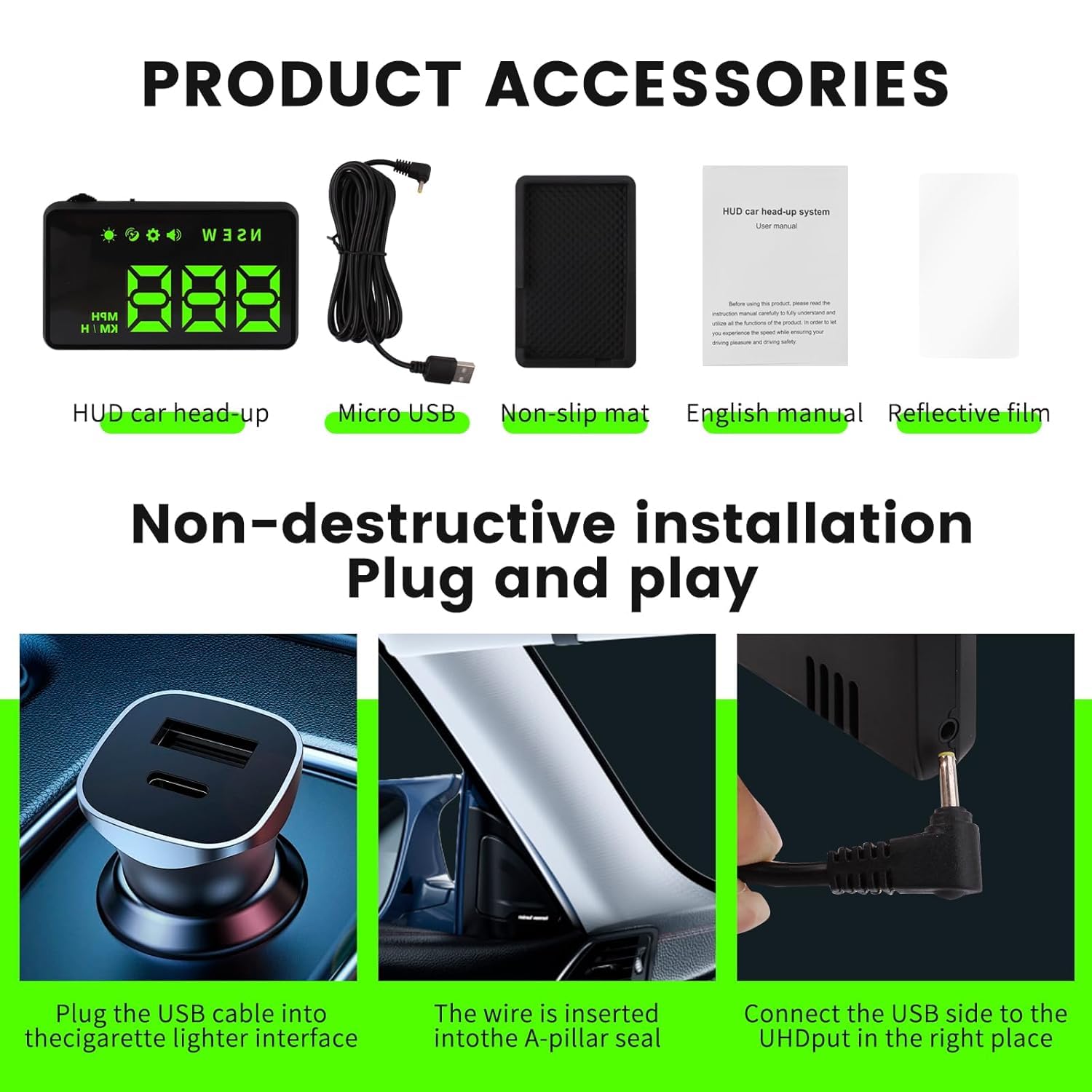 - Suitable for all Cars with USB Port: Designed with simplicity in mind, our HUD is easy to install and suitable for all cars with USB port, including cars, motorcycles, and trucks. Whether you drive a compact sedan or a large commercial vehicle, installation is effortless, allowing you to enjoy the convenience and safety benefits of our HUD