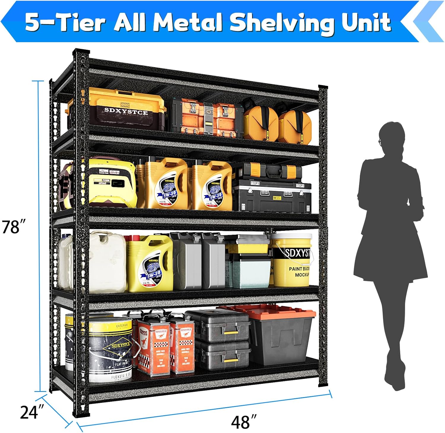 Garage Shelving Heavy Duty 3000LBS Loads, 48" W Adjustable Garage Storage Shelves, 5-Tier Metal Shelving Units and Storage, Industrial Utility Shelf, 48" Wx24 Dx78 H,Silver